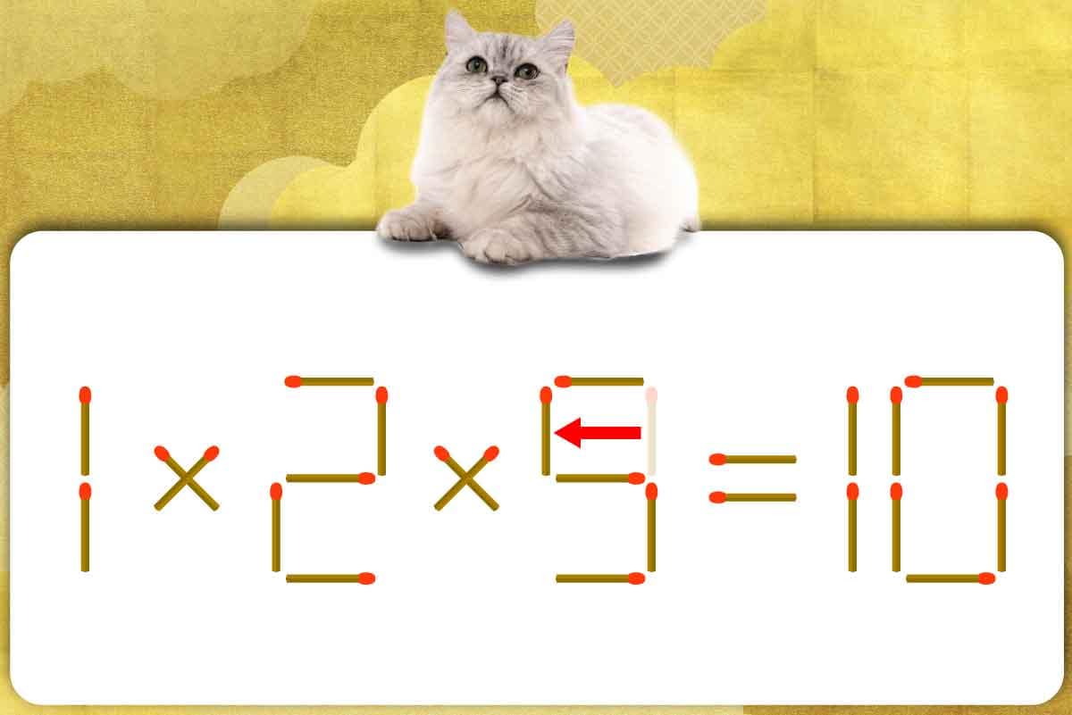 「1」は動かせない数字なので、これはスルーしてOK。「2」は「3」にできるけれど、答えとは一致しません。では最後に「3」。ここの右上にある縦向きのマッチ棒を取り、そのまま左に動かすと数字が「5」になります。出来上がった数式は「1×2×5=10」。きっちりと答えが合いました♪
