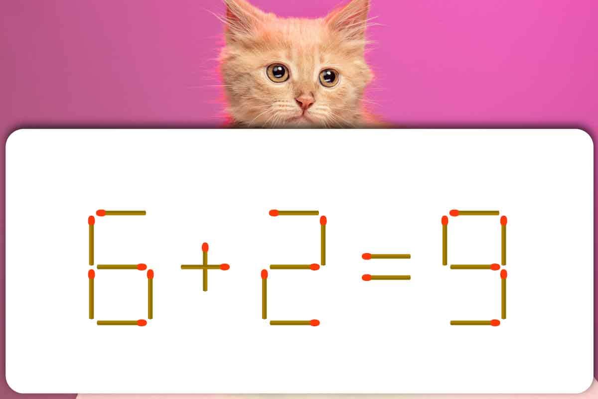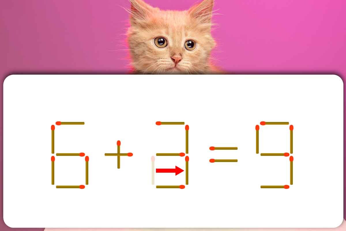 「2」の左下にある縦のマッチ棒を右に寄せます。するとご覧ください、見事「2」が「3」にチェンジしました!よって「6+3=9」となり、正しい計算式の出来上がりです♪