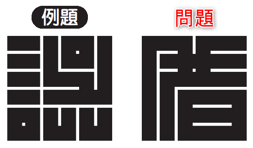 漢字を正方形の箱の中に押し込み、取り出しました。かなり強引に詰めたので、姿はだいぶ変わっていますが、線のつながりはくずしていません。「例題」の漢字は「誤」です。さて、「問題」の漢字はなんでしょうか?