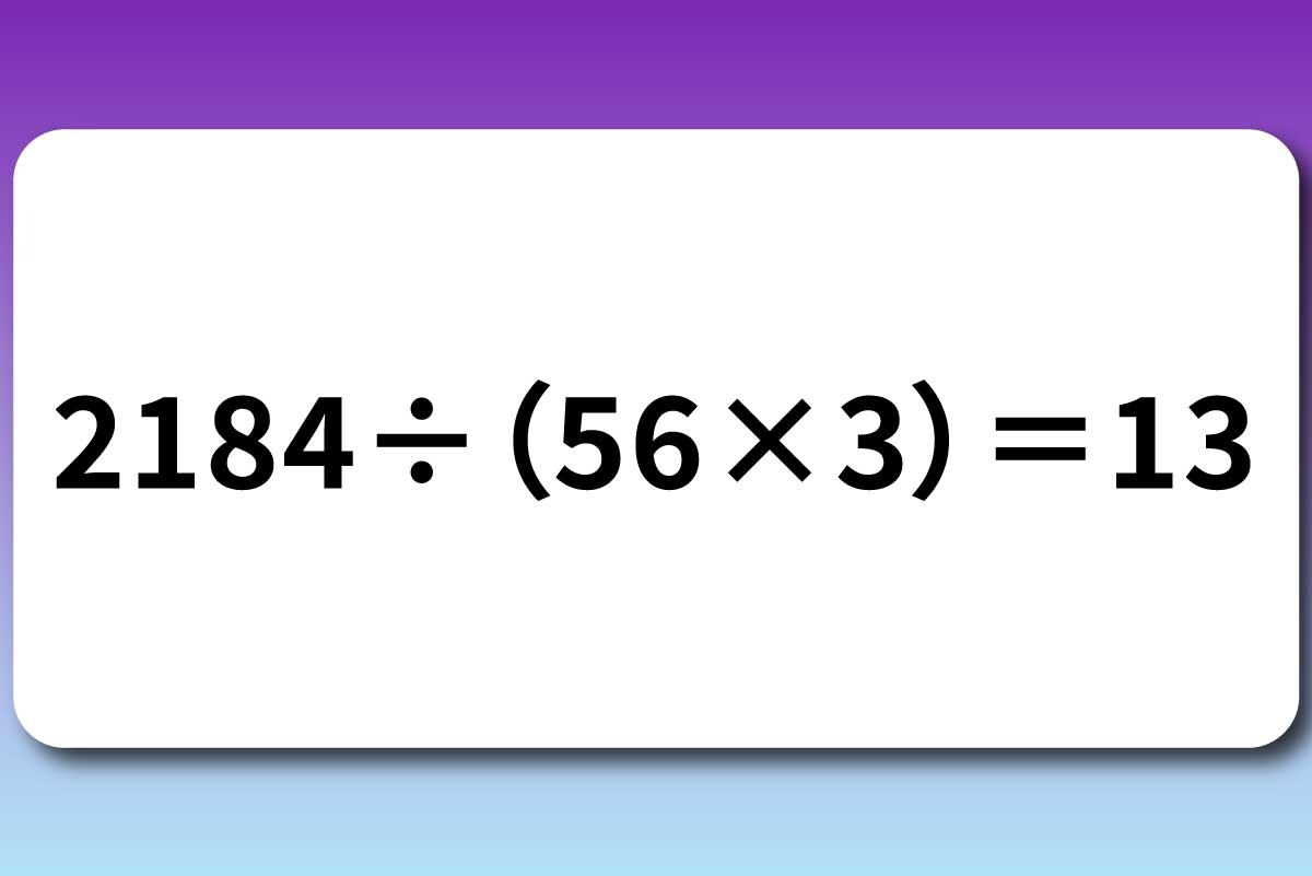 毎日脳トレ! 本日は「算数クイズ」です。小学生で習う式、計算ミスに注意して解いてみましょう。【問題】「2184÷(56×3)」はいくつになる?わかりますか?こたえをみる↓↓↓↓↓↓↓↓↓↓【答】13正解できましたか?