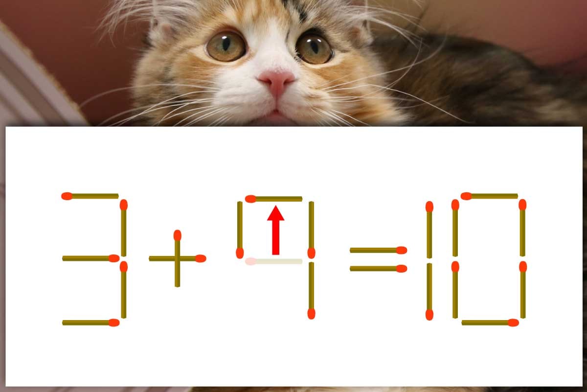 「4」の真ん中のマッチ棒を上にスライドし「7」に変化させ、「3+7=10」にする。※解答は複数ある場合があります。