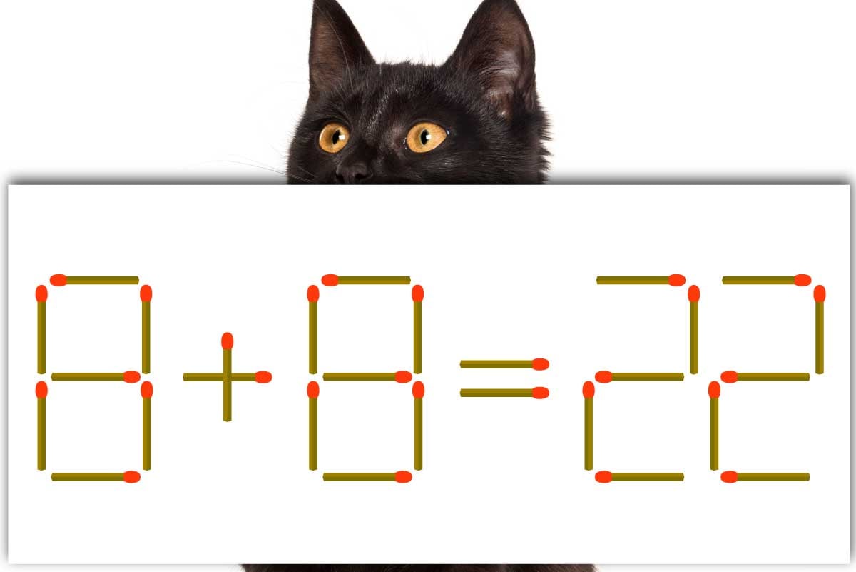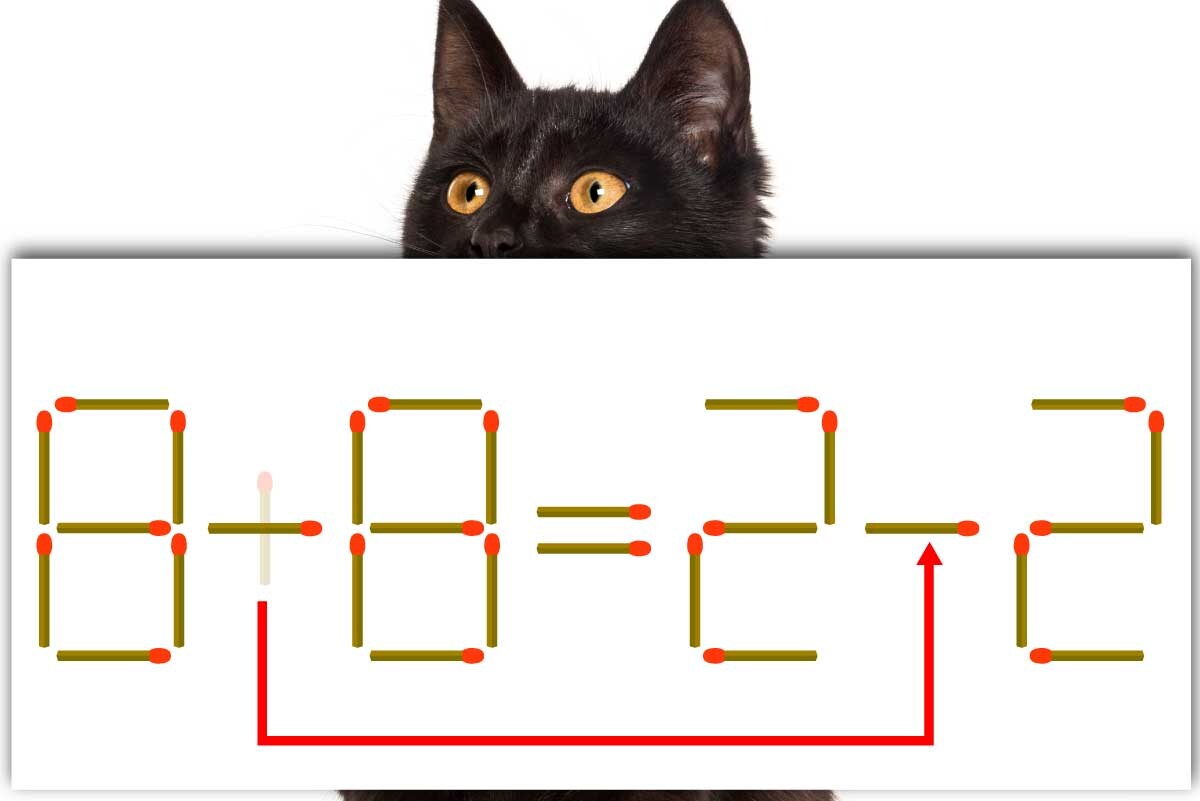 「+」のマッチ棒を1本、「22」の間に移動させて「-」を作り、「8-8=2-2」にする。※解答は複数ある場合があります。