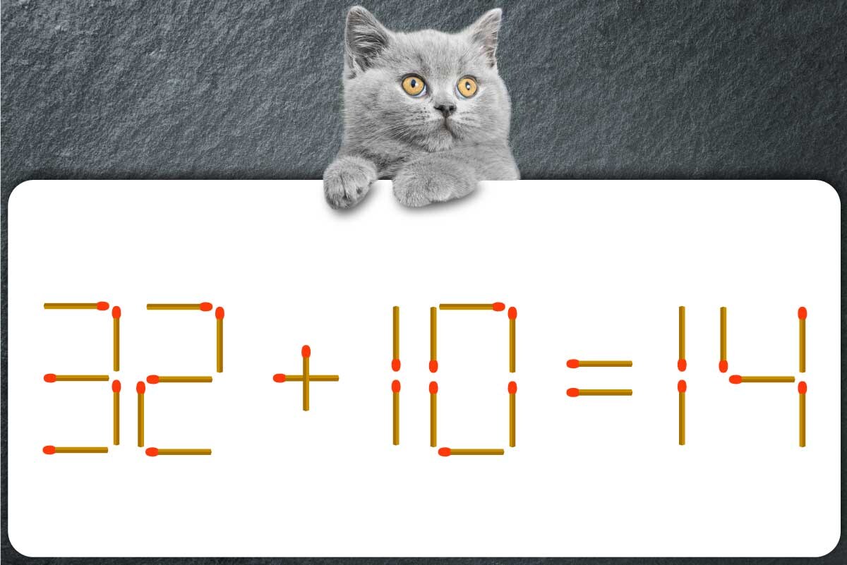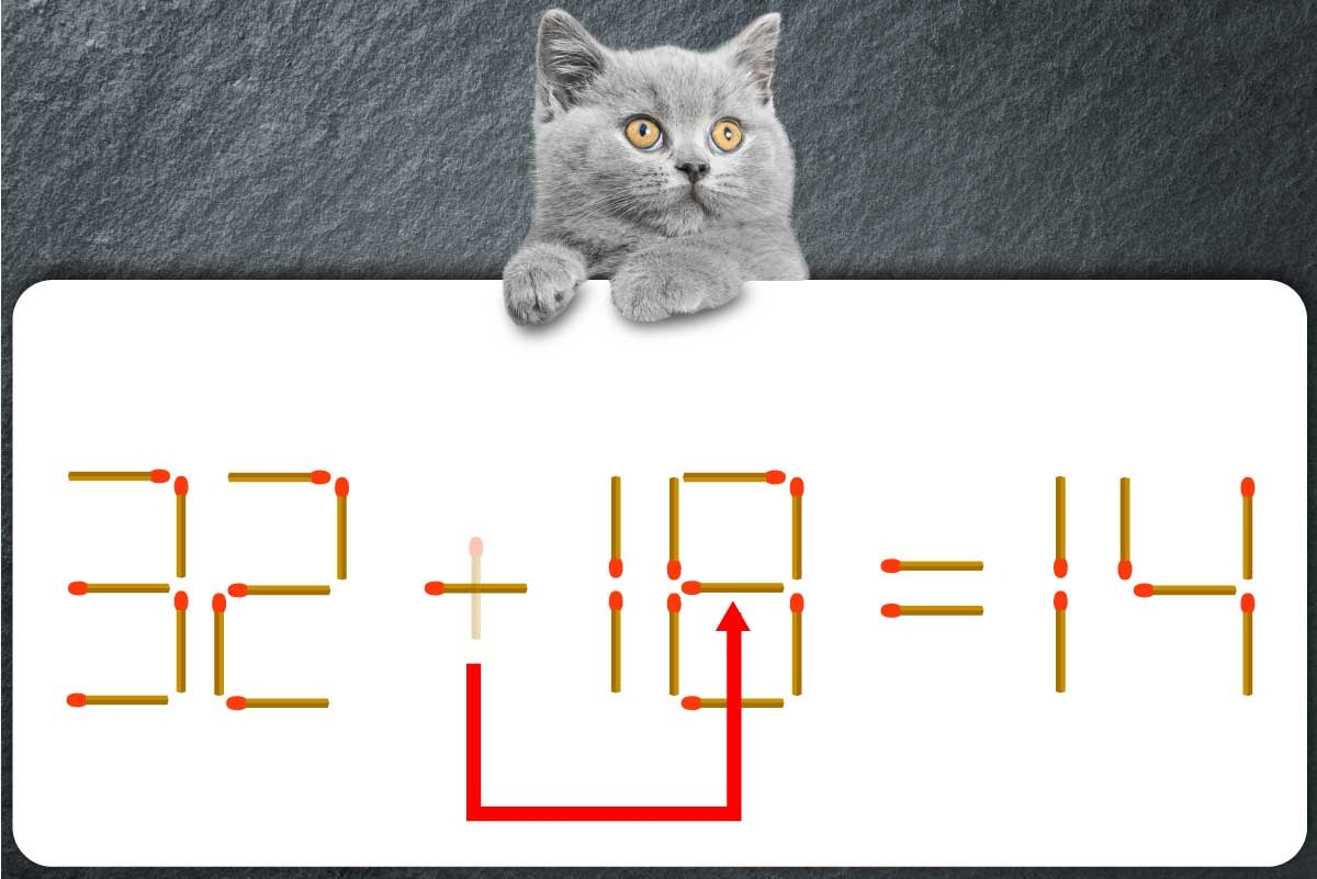 「+」のマッチ棒を1本、「0」に移動させて「8」を作り「32-18=14」にする。