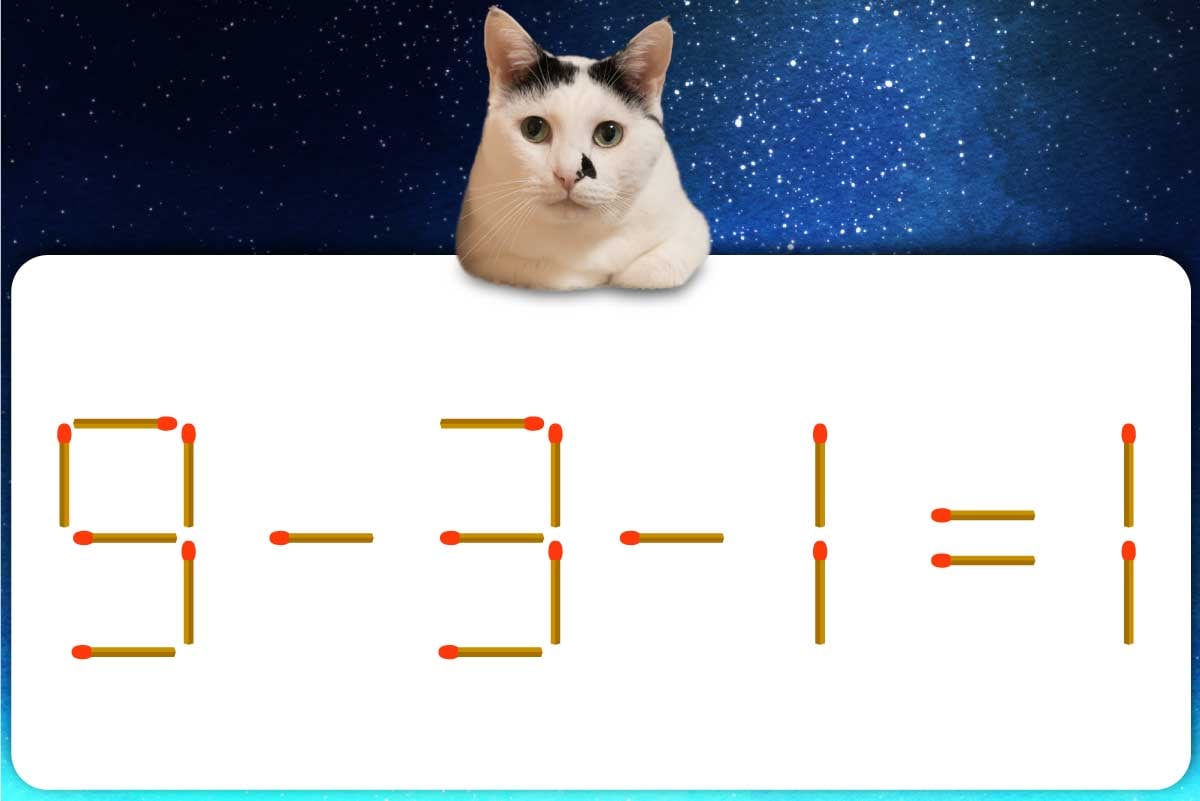 「9」のマッチ棒を1本、「-」に移動させて「+」を作り、「3-3+1=1」にする。※解答は複数ある場合があります。