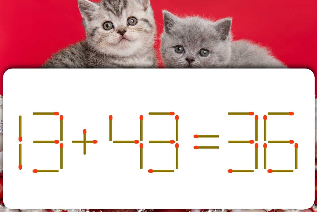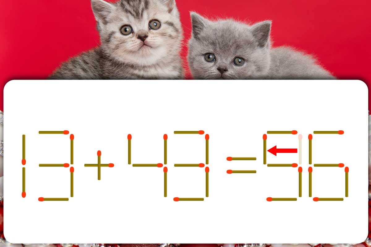「36」の「3」にあるマッチ棒を1本、左にスライドして「5」を作り、「13+43=56」にする。※解答は複数ある場合があります。