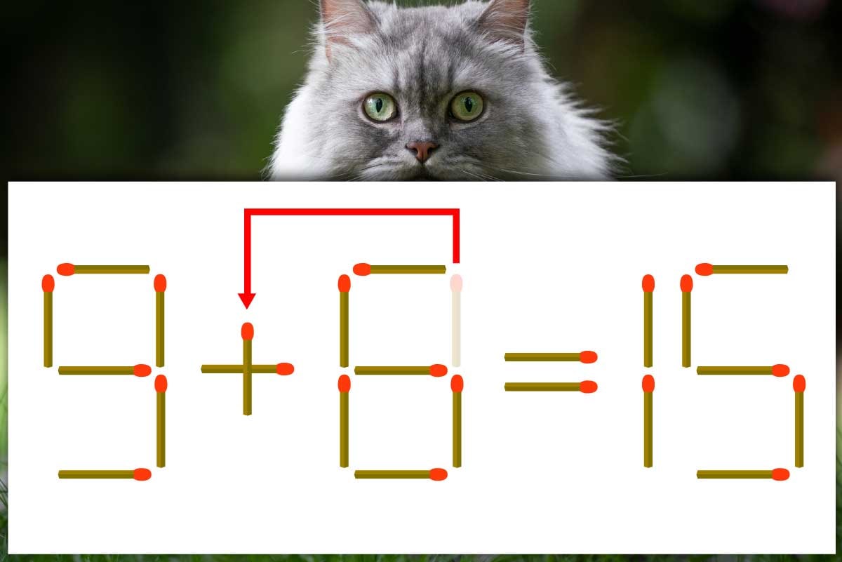 「8」のマッチ棒を1本、「-」に移動させて「+」を作り、「9+6=15」にする。※解答は複数ある場合があります。