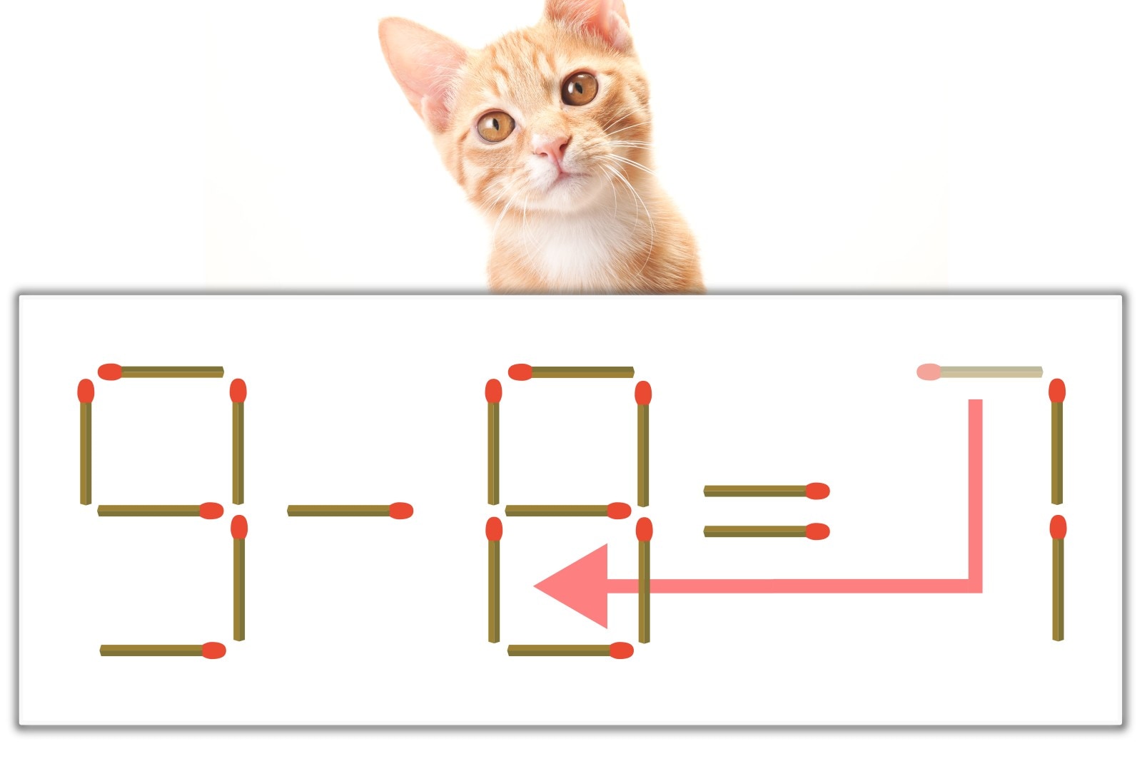 「7」のマッチ棒を1本、左にスライドさせて「8」を作り、「9-8=1」にする。※解答は複数ある場合があります。