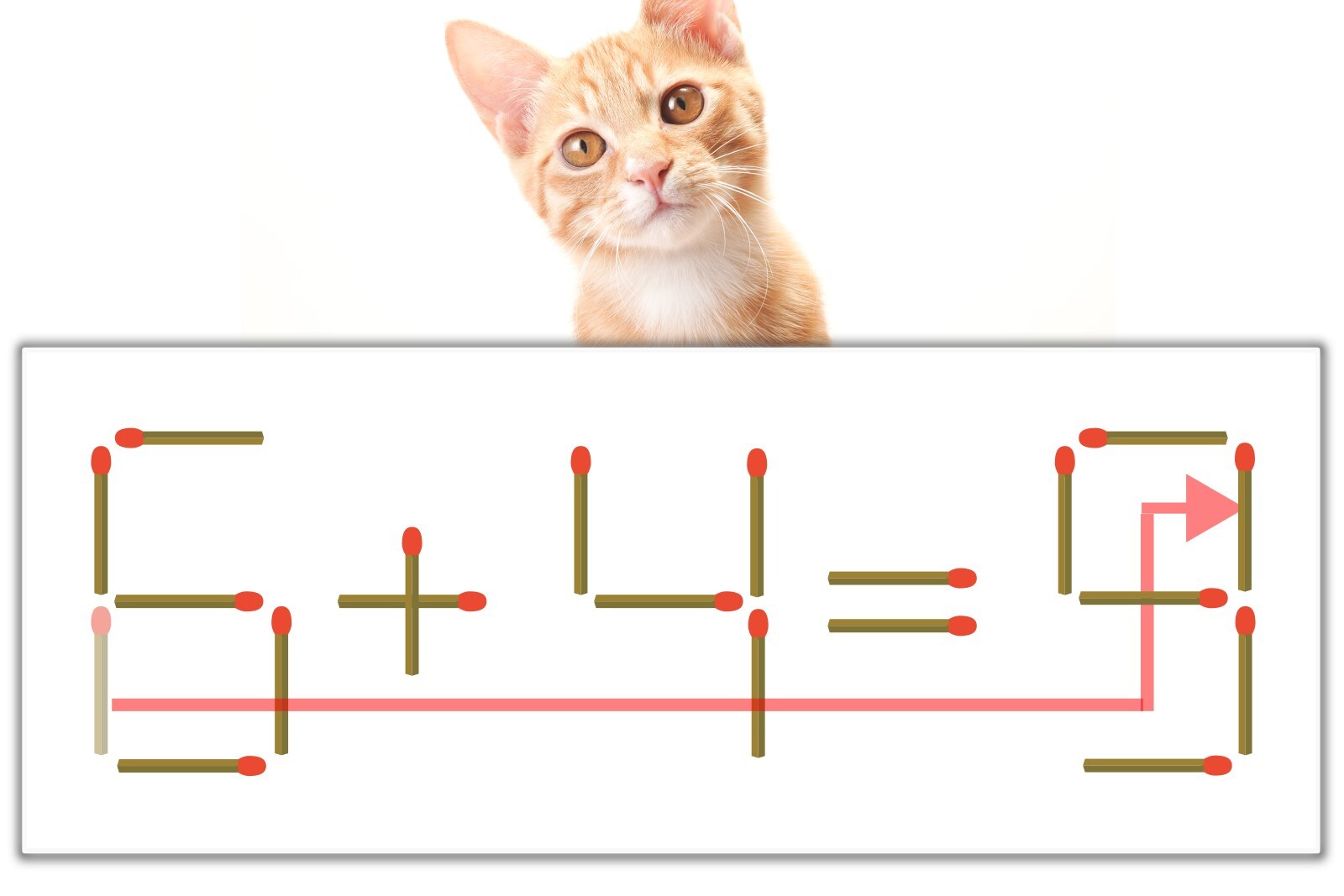 「6」のマッチ棒を1本、右にスライドさせて答えで「9」を作り、「5+4=9」にする。※解答は複数ある場合があります。