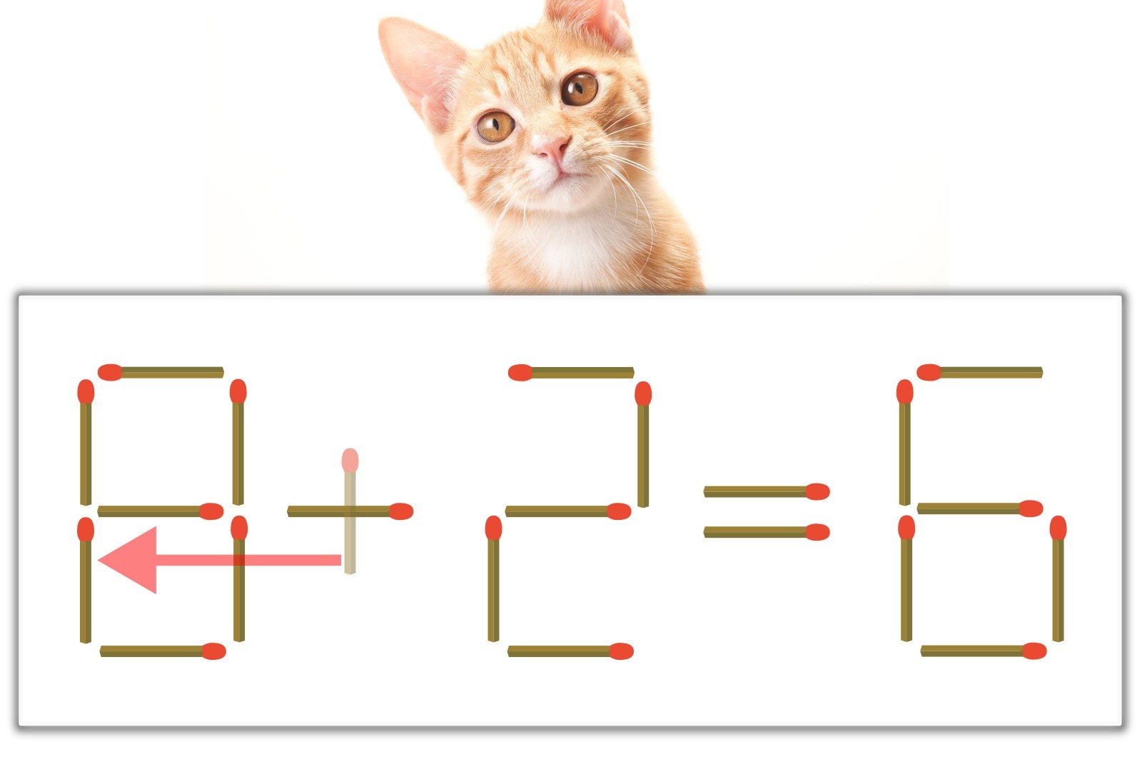 「+」のマッチ棒を1本、左にスライドさせて「8」を作り、「8-2=6」にする。※解答は複数ある場合があります。