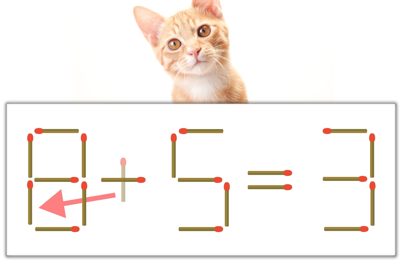 「+」のマッチ棒を1本、左にスライドさせて「8」を作り、「8-5=3」にする。※解答は複数ある場合があります。