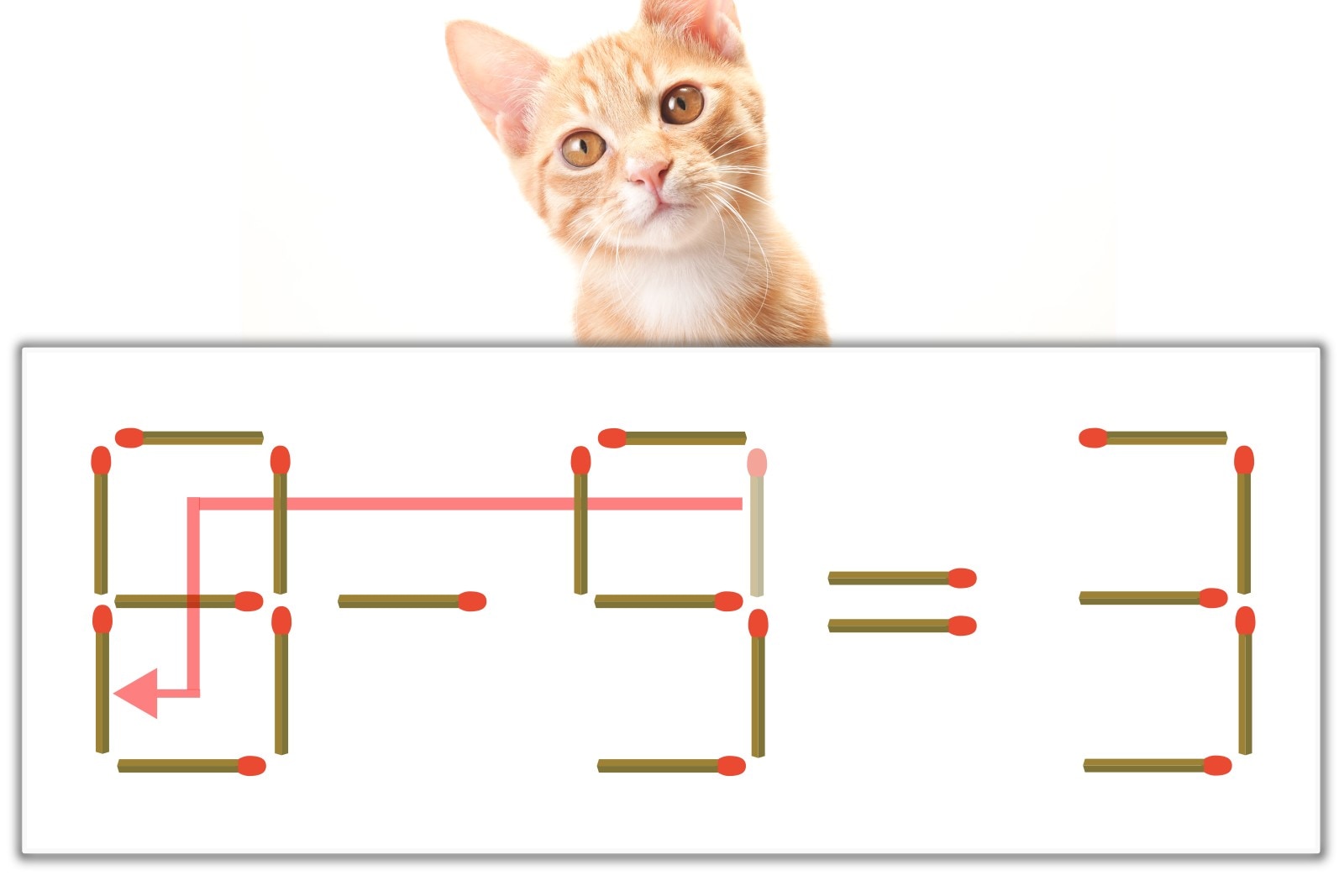 「9」のマッチ棒を1本、左にスライドさせて「8」を作り、「8-5=3」にする。※解答は複数ある場合があります。