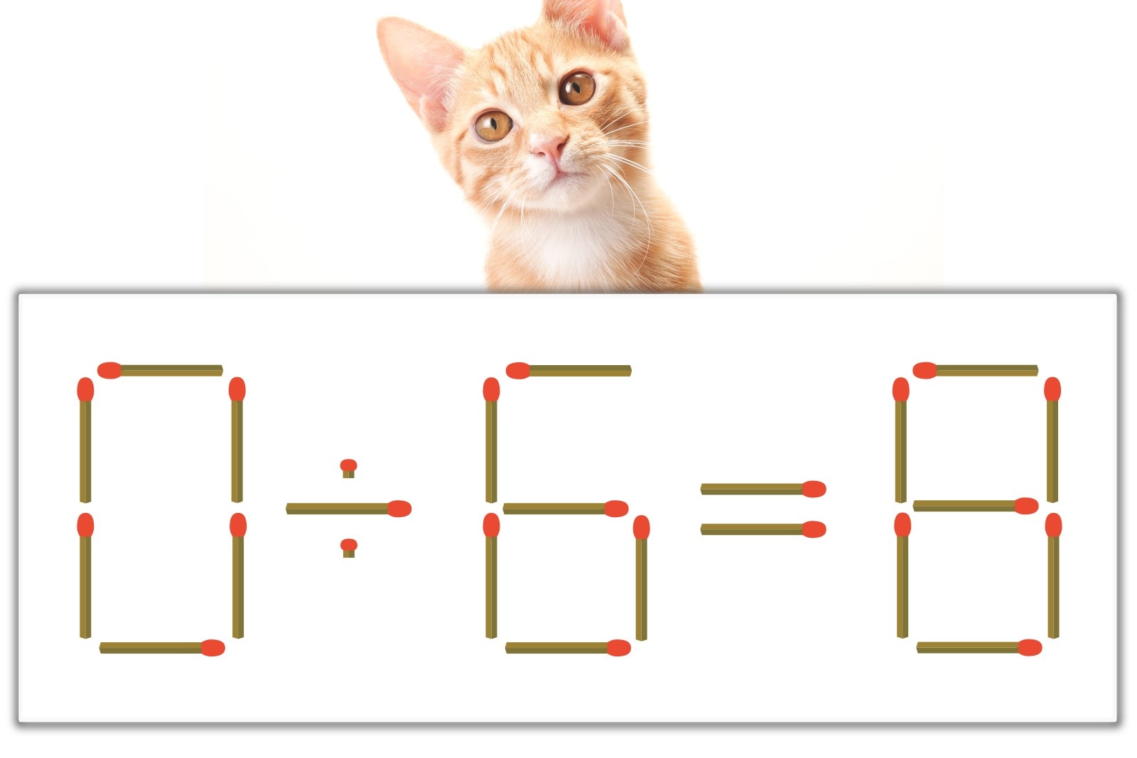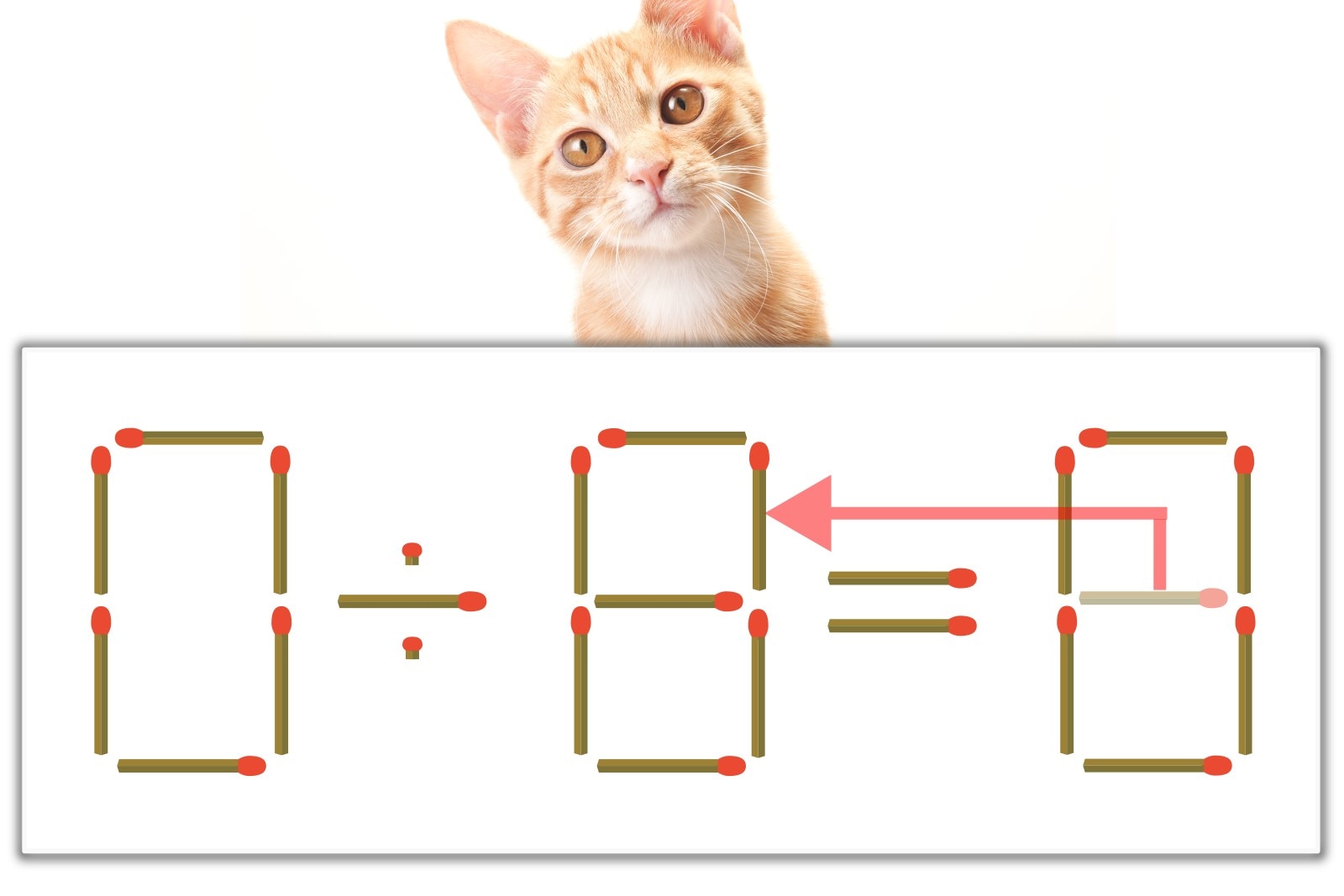 「8」のマッチ棒を1本、左にスライドさせて「8」を作り、「0÷8=0」にする。※解答は複数ある場合があります。