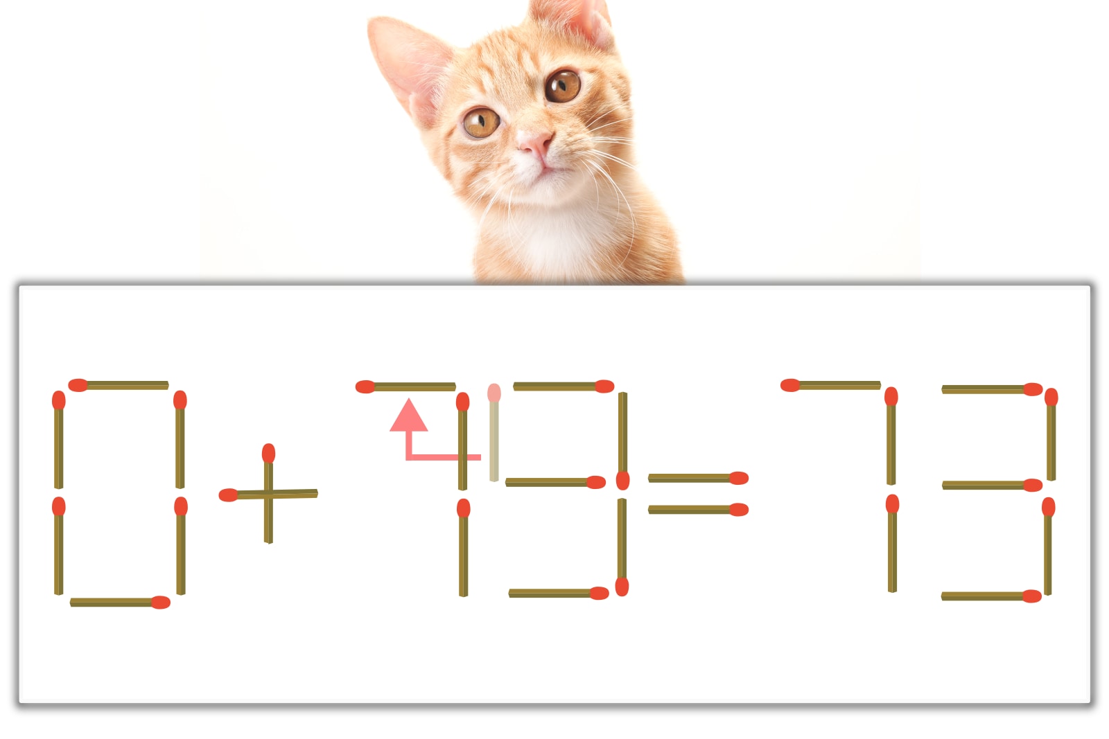 「9」のマッチ棒を1本、左にスライドさせて「7」を作り、「0+73=73」にする。※解答は複数ある場合があります。