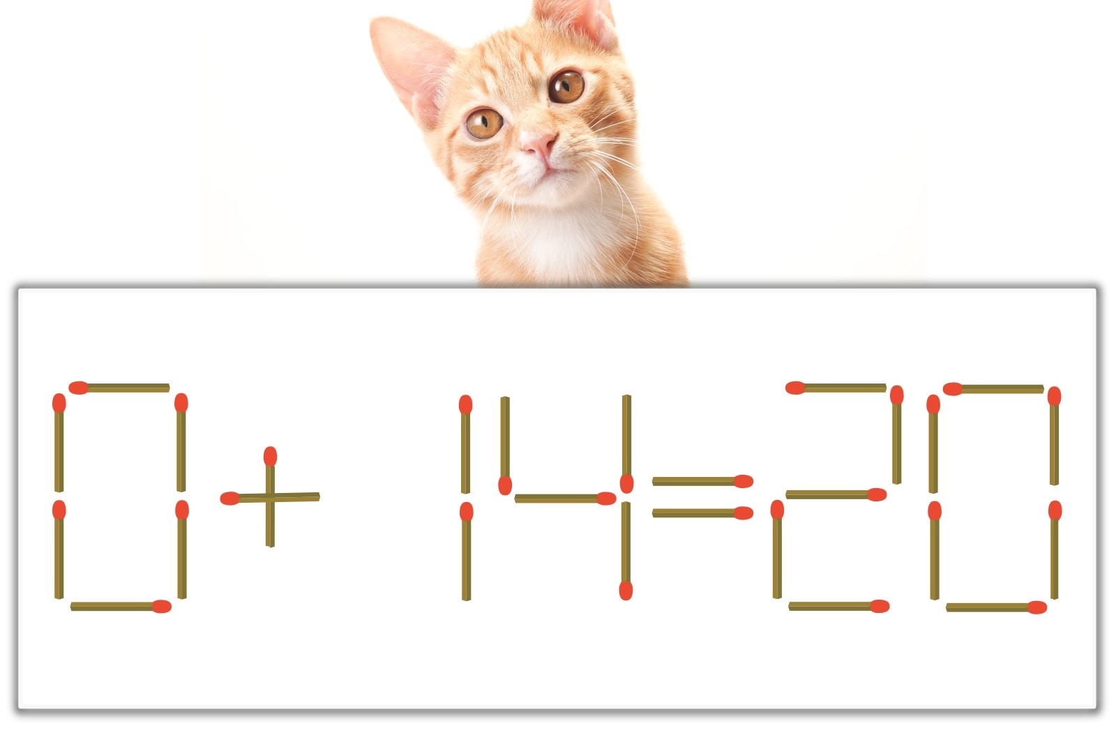 「0」のマッチ棒を1本、左下にスライドさせて「6」を作り、「6+14=20」にする。※解答は複数ある場合があります。