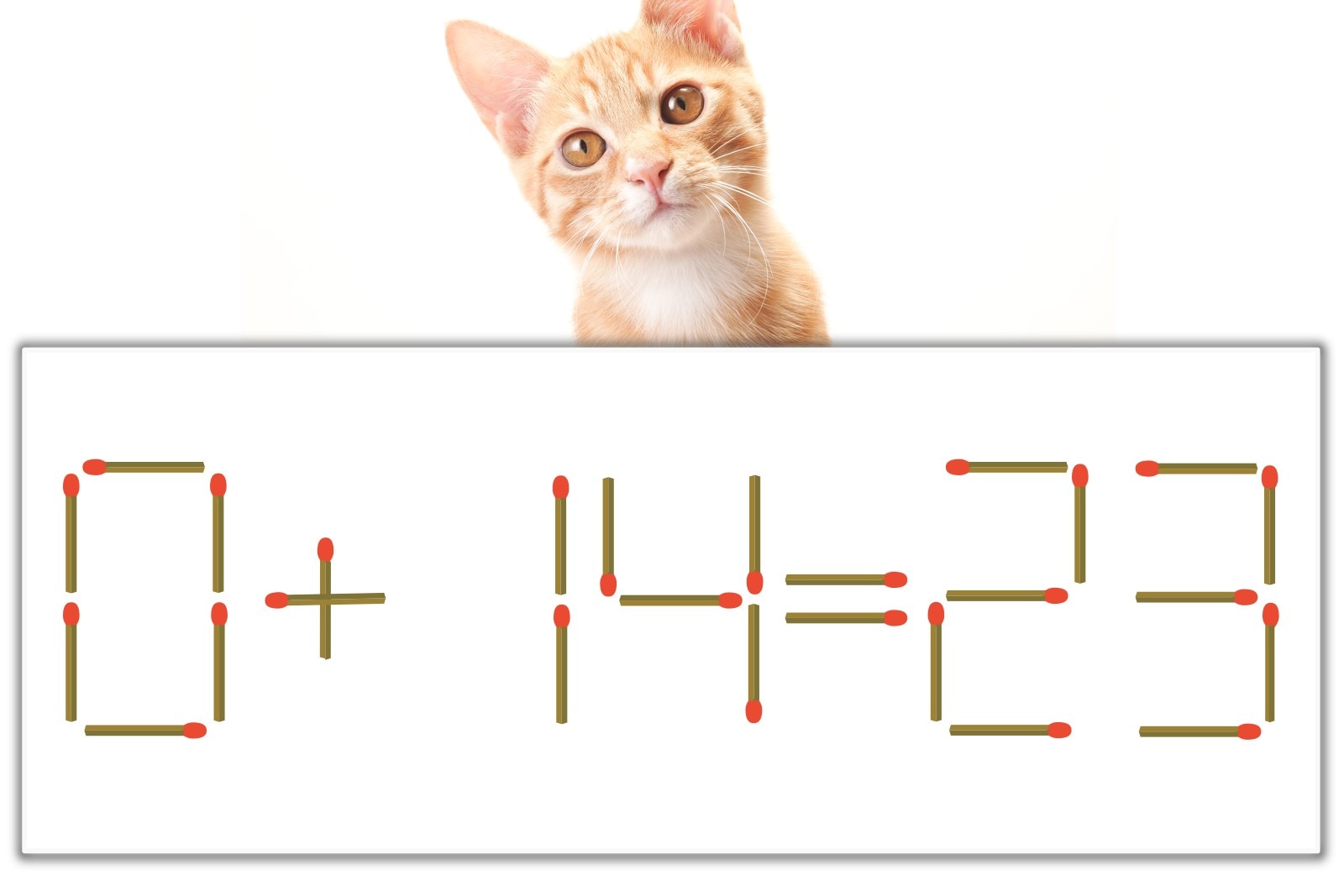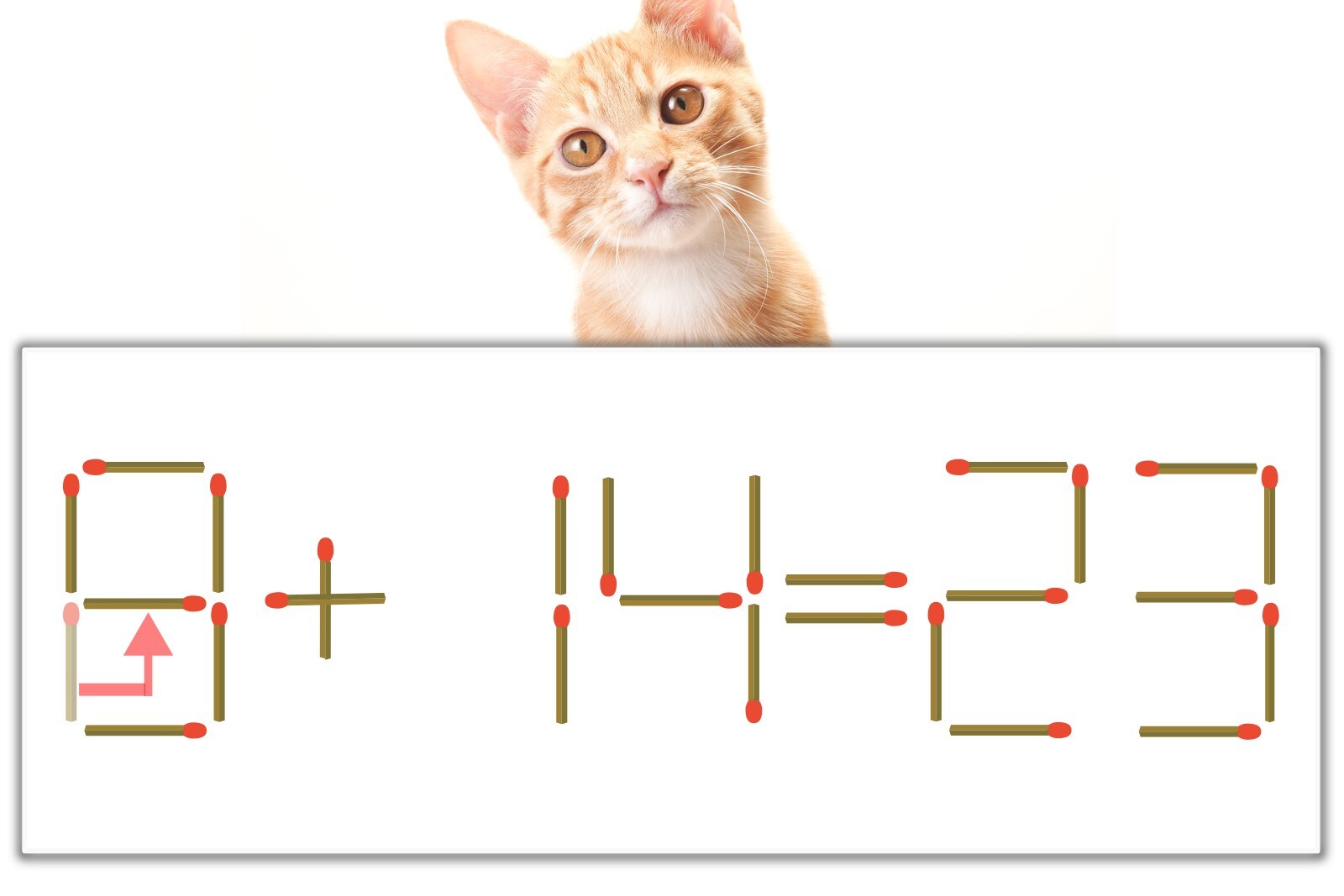 「0」のマッチ棒を1本、右上にスライドさせて「9」を作り、「9+14=23」にする。※解答は複数ある場合があります。