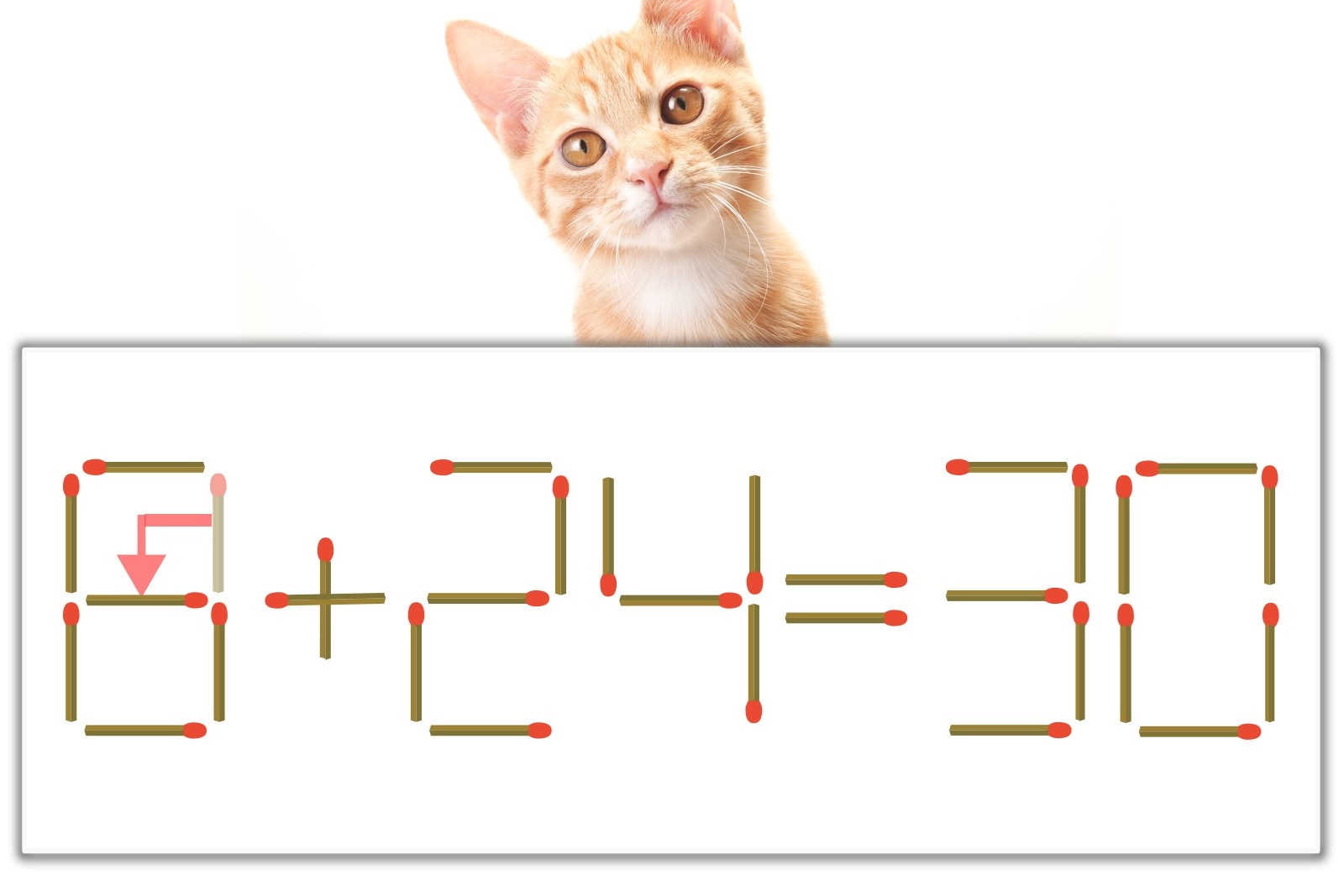 「0」のマッチ棒を1本、左下にスライドさせて「6」を作り、「6+24=30」にする。※解答は複数ある場合があります。