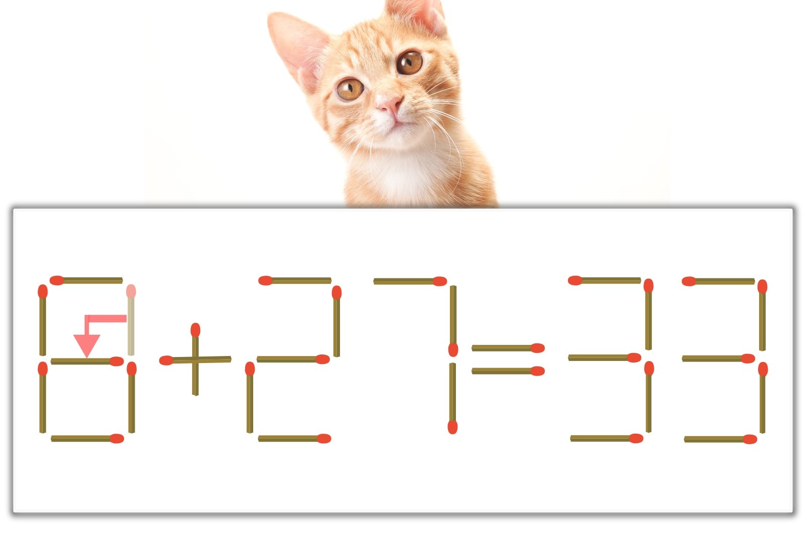 「0」のマッチ棒を1本、左下にスライドさせて「6」を作り、「6+27=33」にする。※解答は複数ある場合があります。