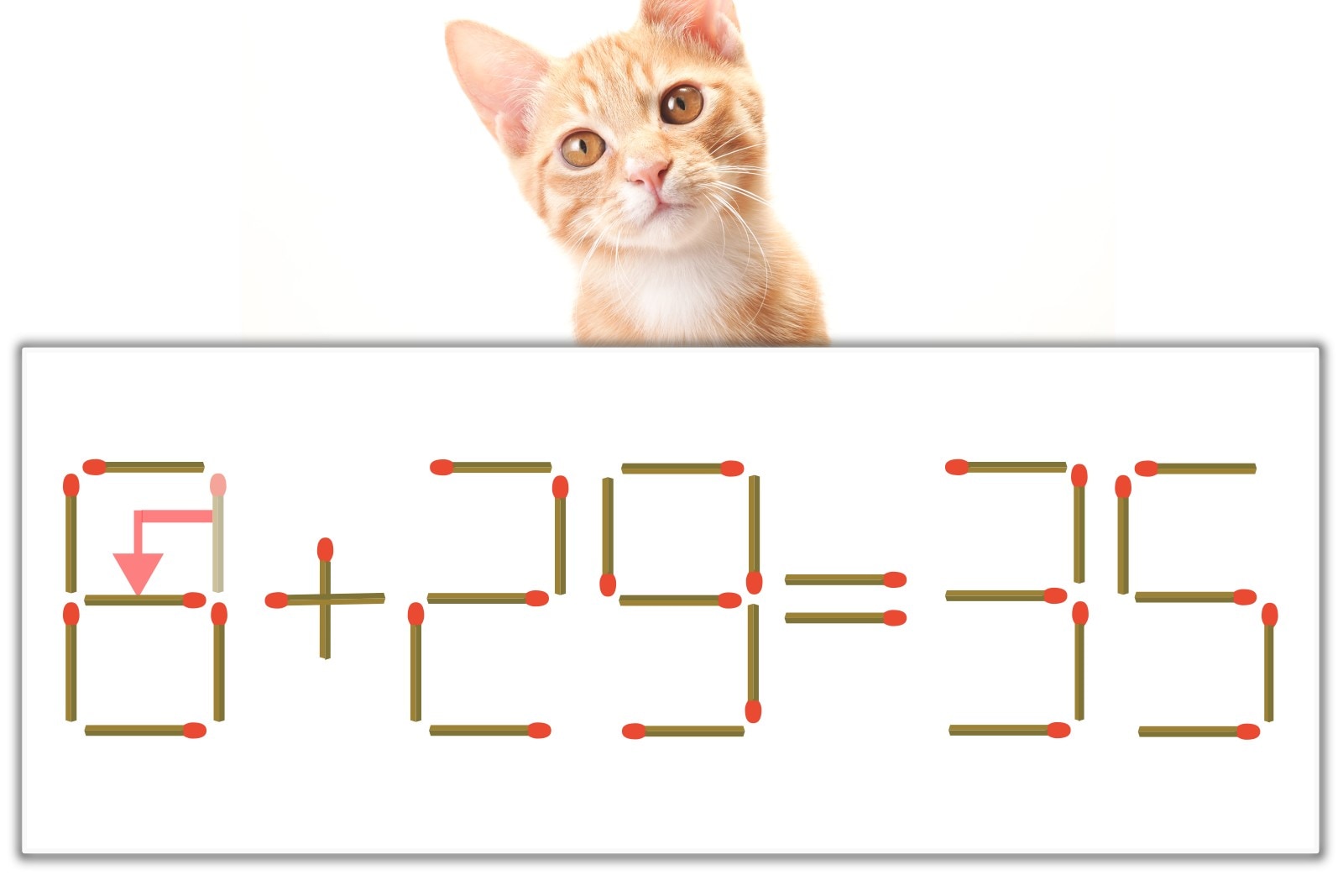 「0」のマッチ棒を1本、左下にスライドさせて「6」を作り、「6+29=35」にする。※解答は複数ある場合があります。