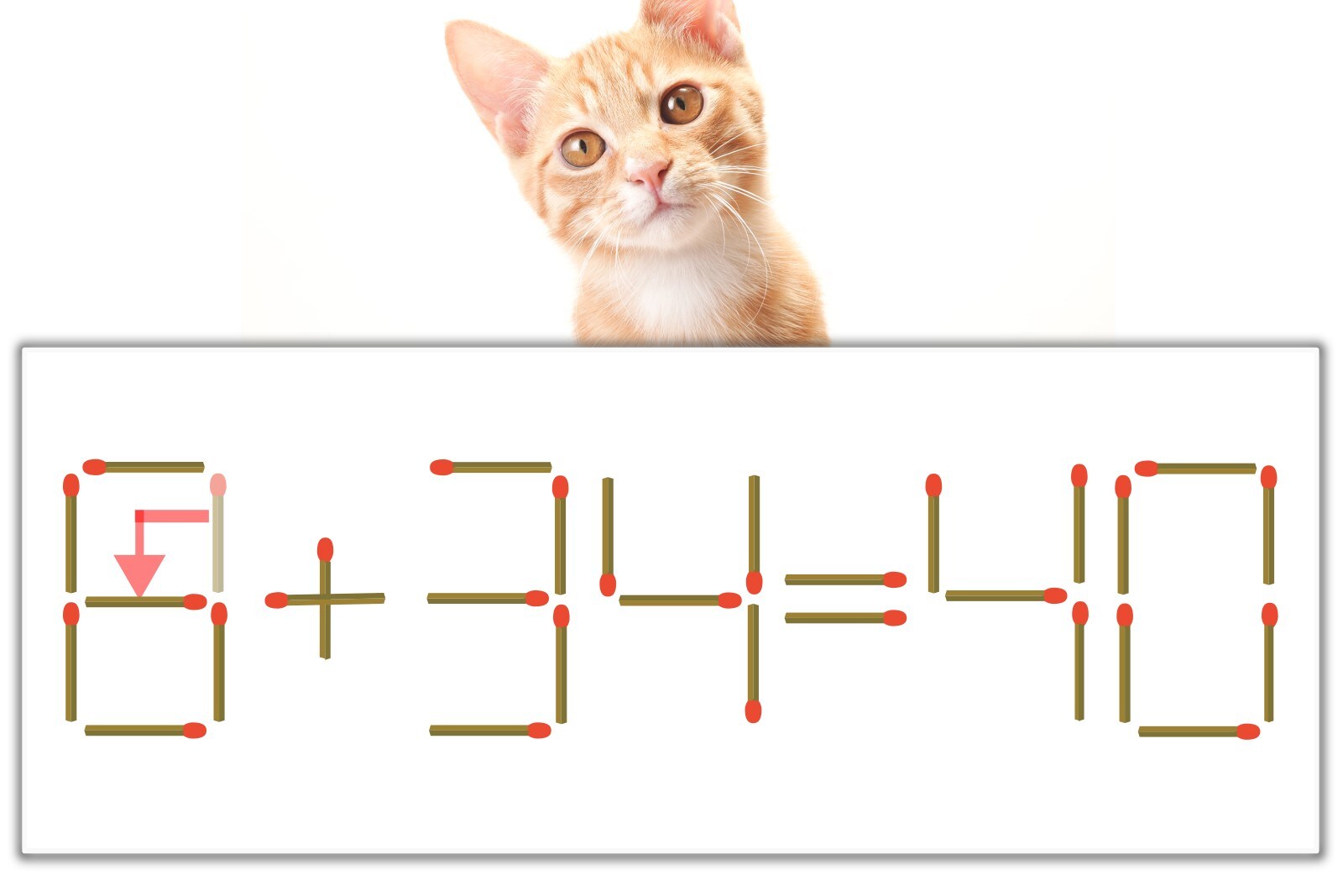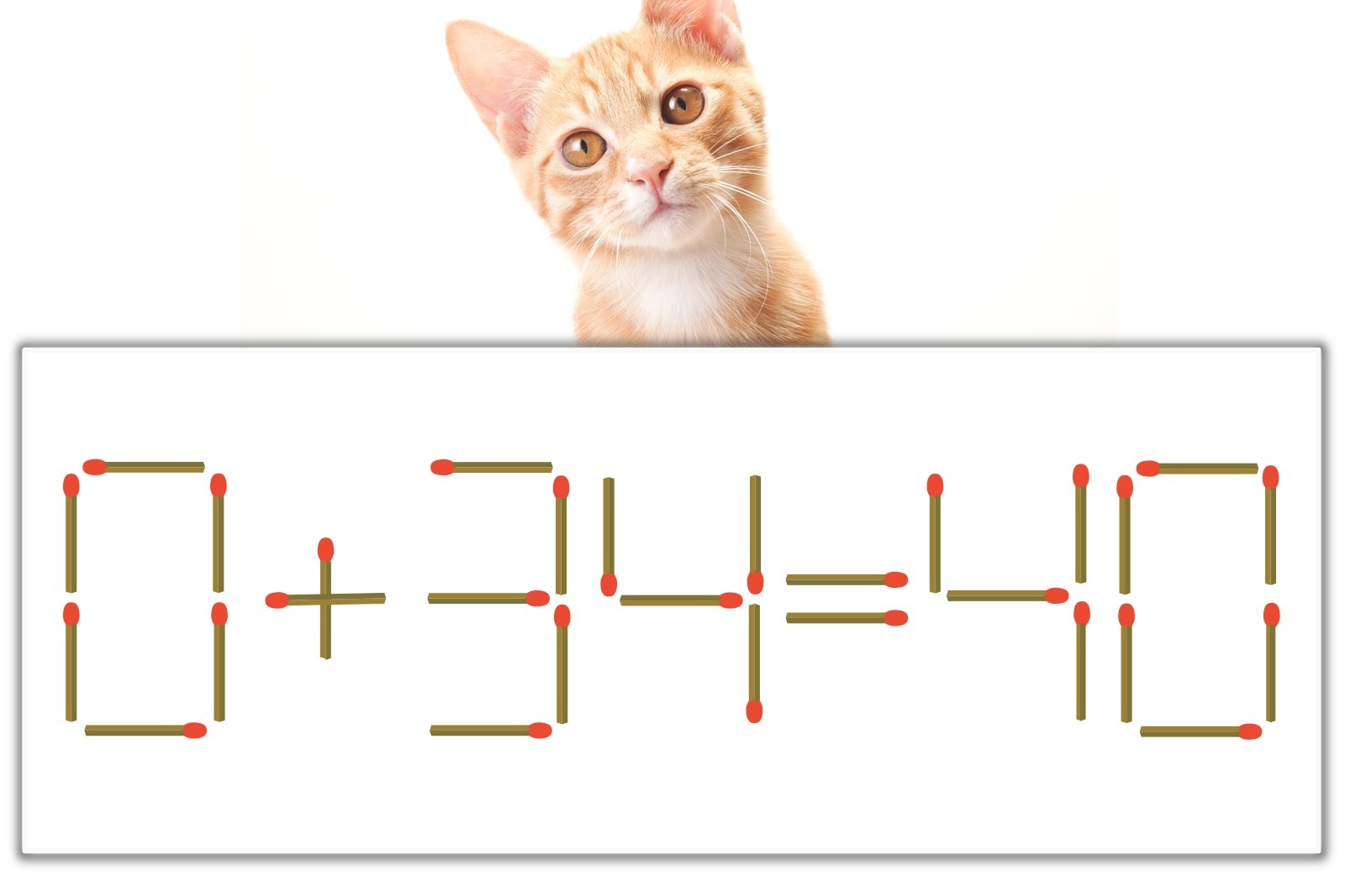 「0」のマッチ棒を1本、左下にスライドさせて「6」を作り、「6+34=40」にする。※解答は複数ある場合があります。
