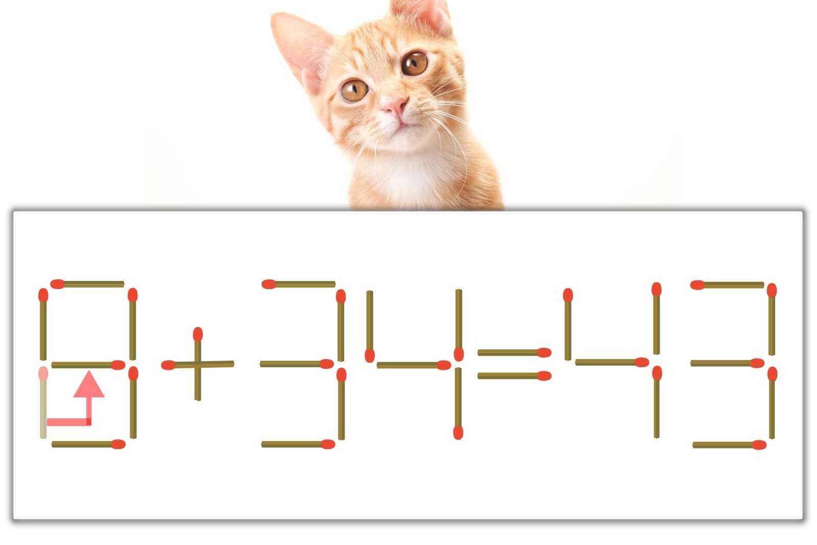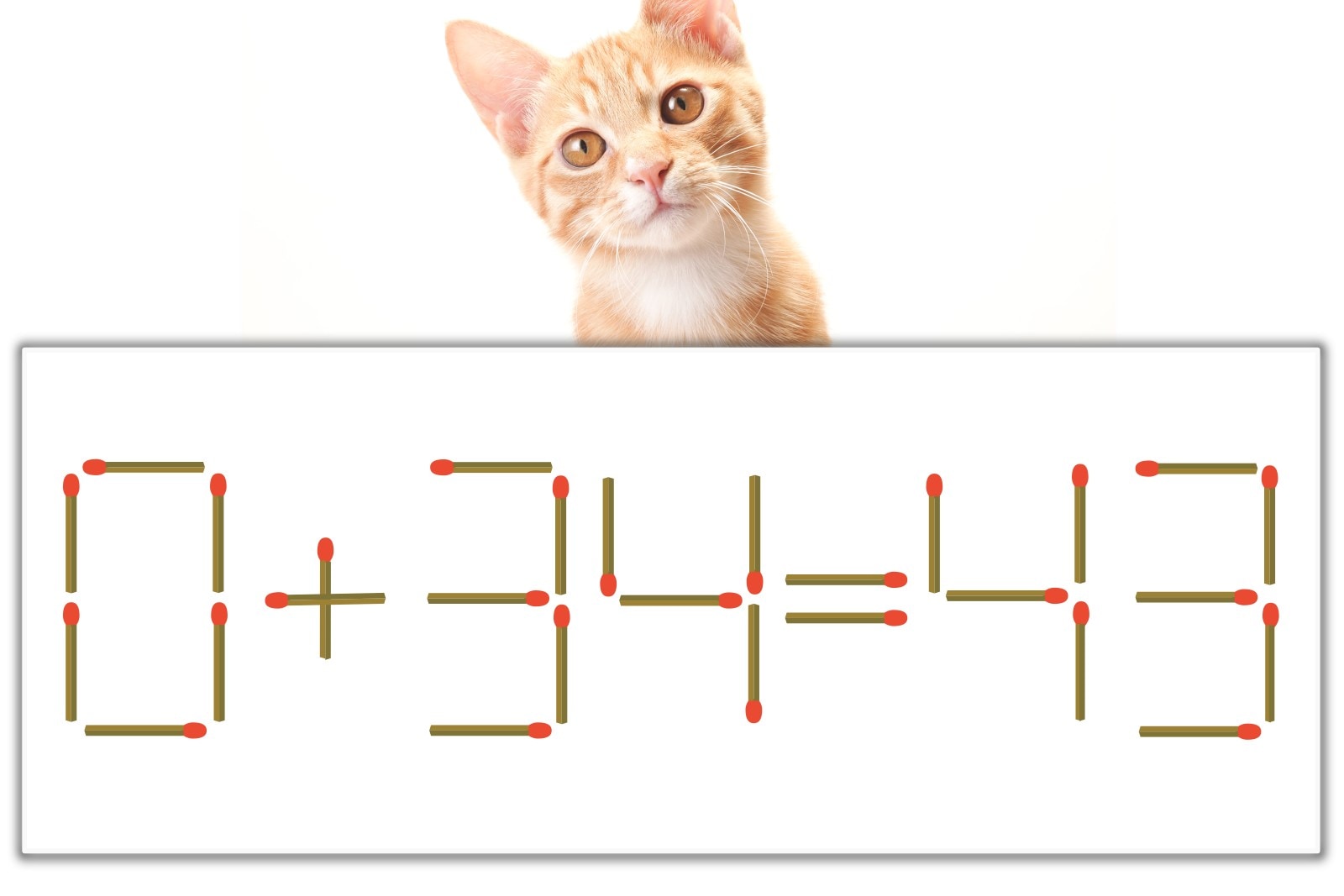 「0」のマッチ棒を1本、右上にスライドさせて「9」を作り、「9+34=43」にする。※解答は複数ある場合があります。