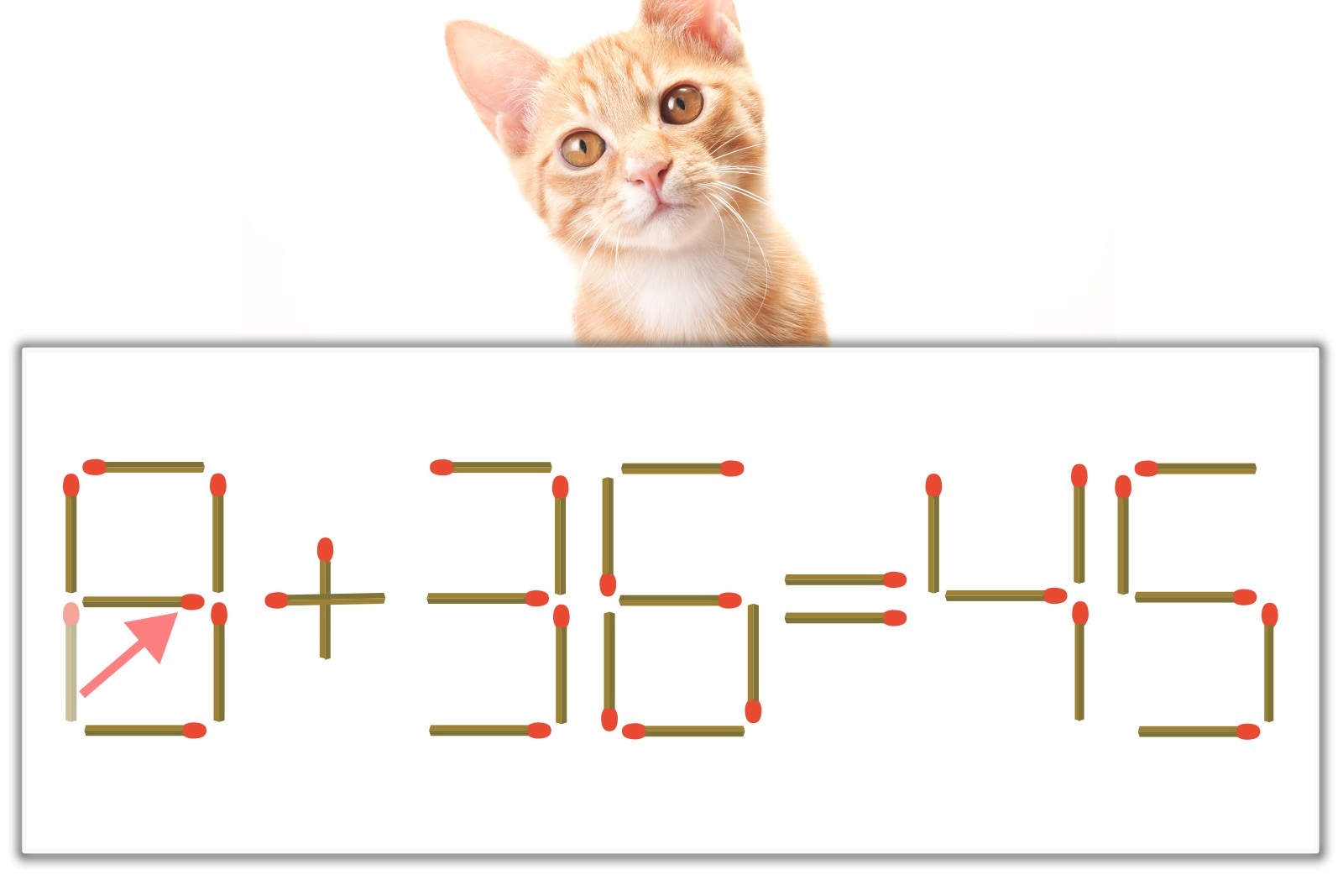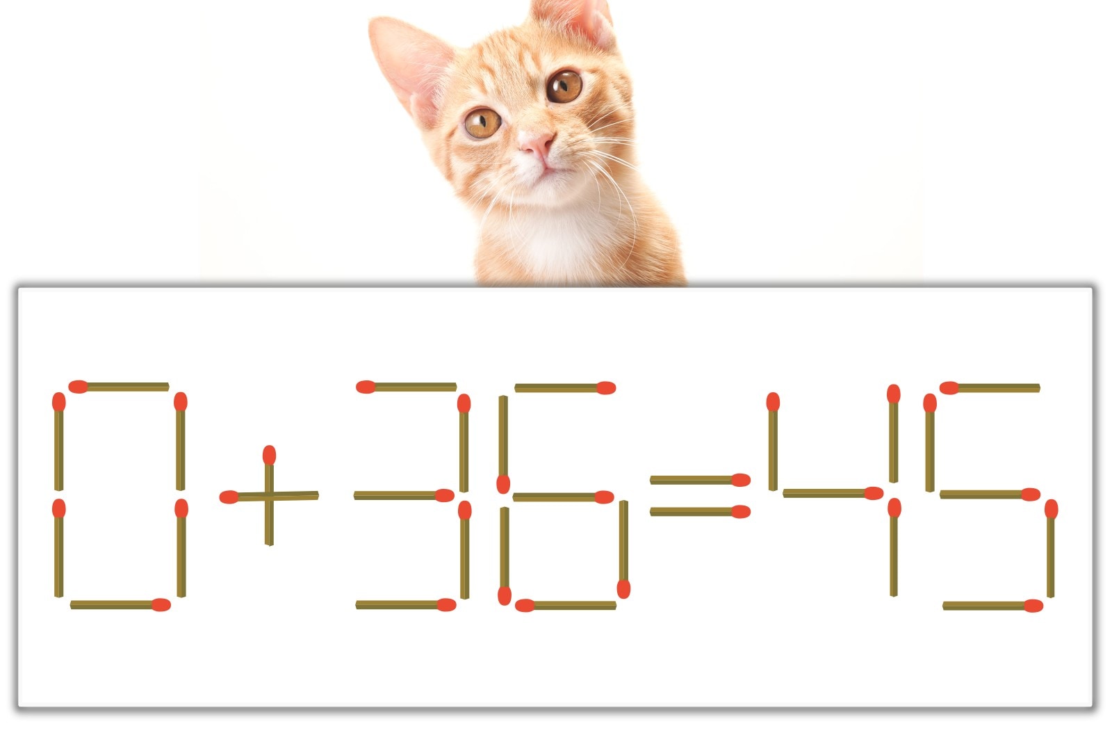 「0」のマッチ棒を1本、右上にスライドさせて「9」を作り、「9+36=45」にする。※解答は複数ある場合があります。