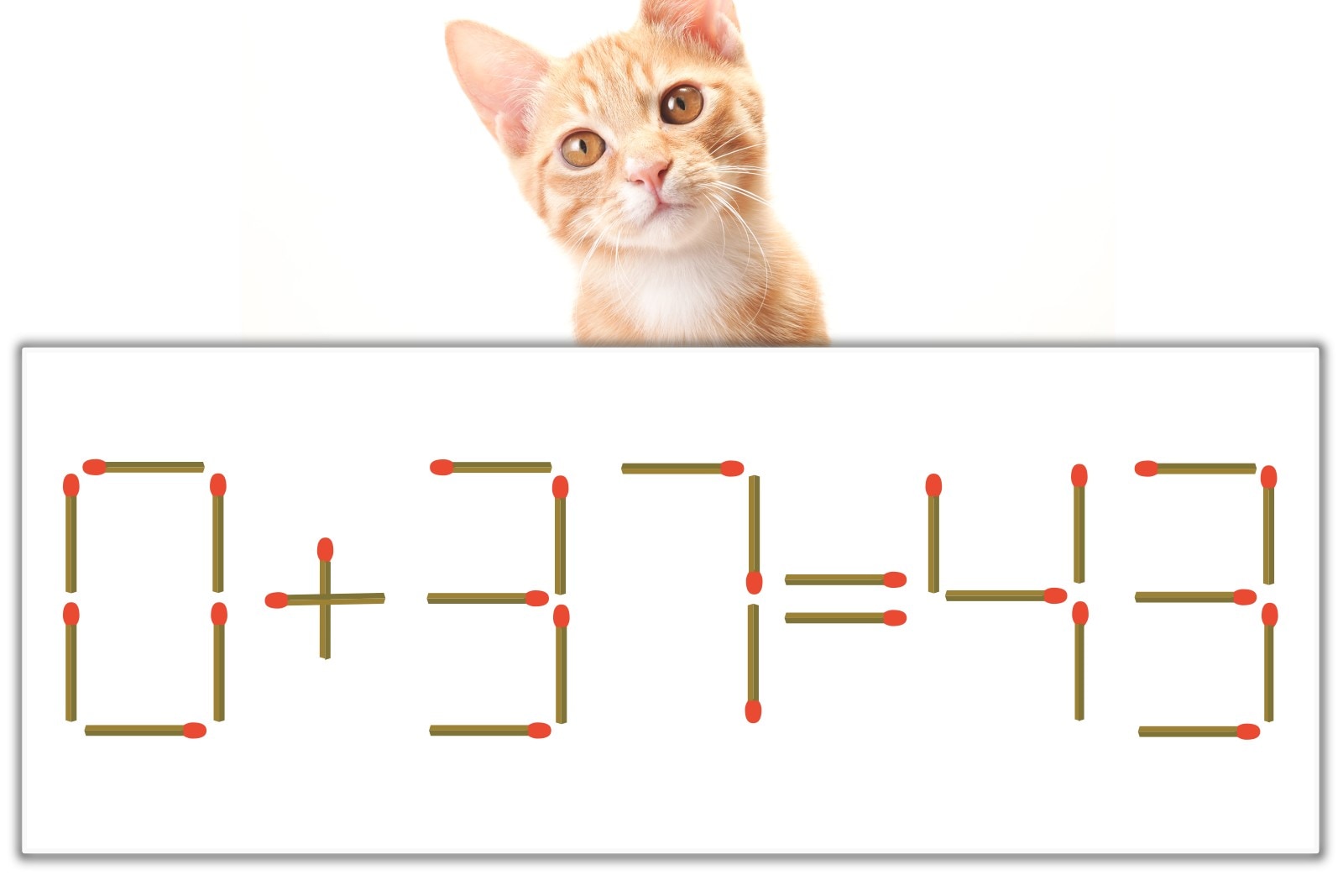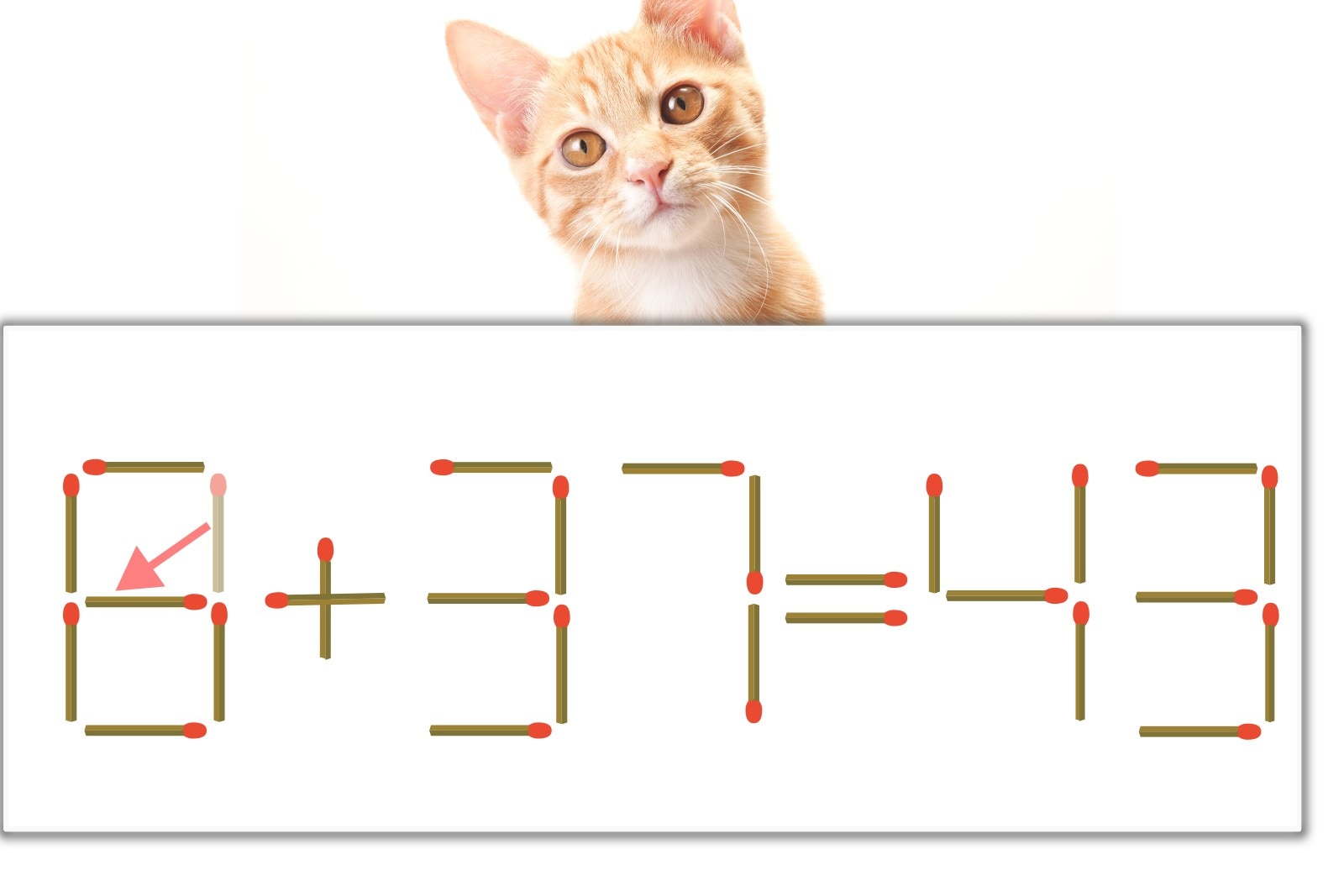 「0」のマッチ棒を1本、左下にスライドさせて「6」を作り、「6+37=43」にする。※解答は複数ある場合があります。