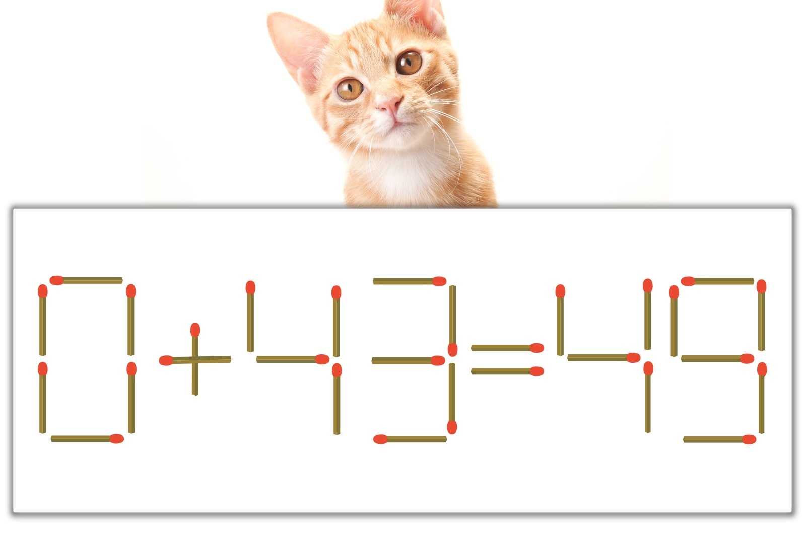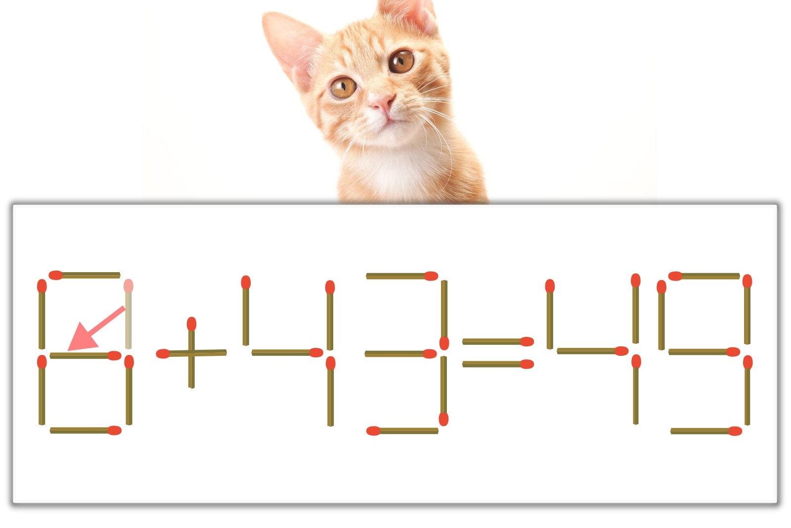 「0」のマッチ棒を1本、左下にスライドさせて「6」を作り、「6+43=49」にする。※解答は複数ある場合があります。