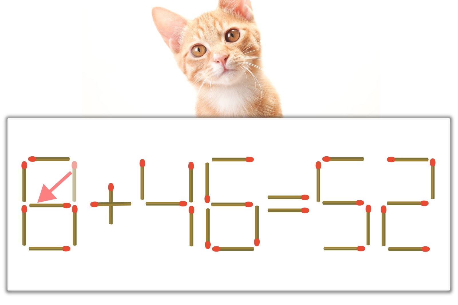 「0」のマッチ棒を1本、左下にスライドさせて「6」を作り、「6+46=52」にする。※解答は複数ある場合があります。