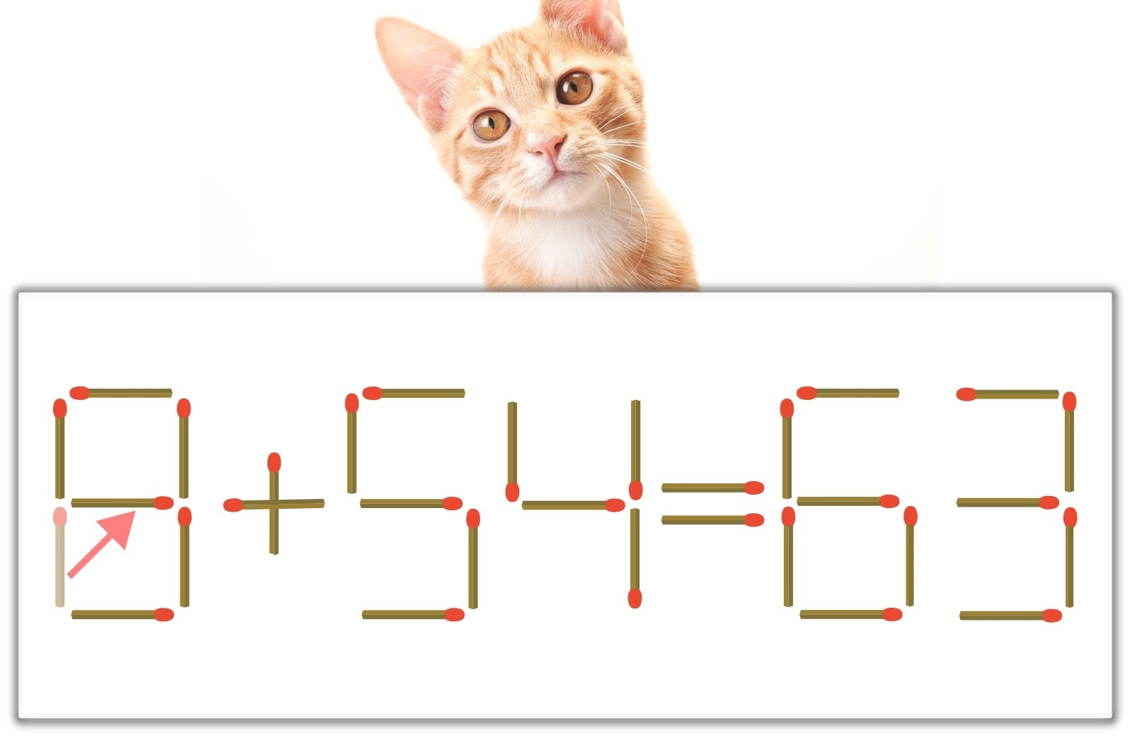 「0」のマッチ棒を1本、右上にスライドさせて「9」を作り、「9+54=63」にする。※解答は複数ある場合があります。
