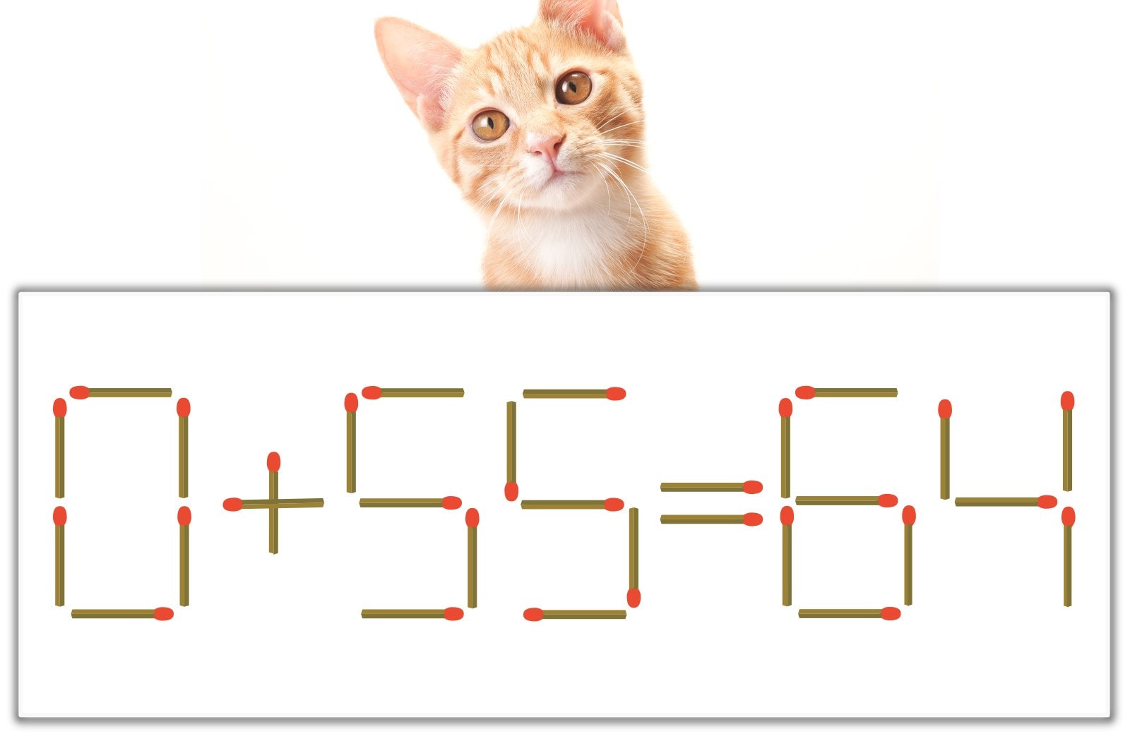 「0」のマッチ棒を1本、右上にスライドさせて「9」を作り、「9+55=64」にする。※解答は複数ある場合があります。
