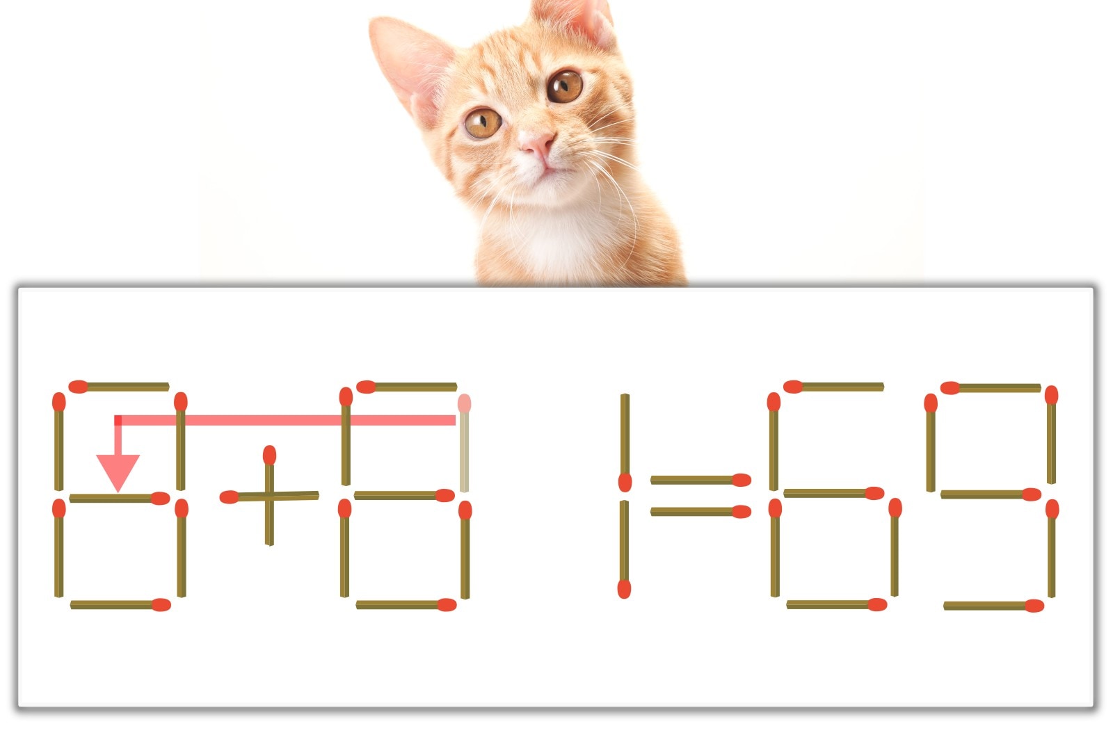 問題の「0」を別の数字に変化させると答えが導き出せそうです。8のマッチ棒を移動させて、「0」を「8」にすると「8+61=69」が完成!