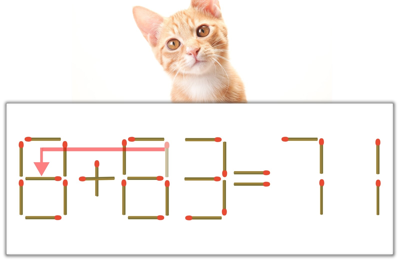 問題の「8」を別の数字に変化させると答えが導き出せます。8のマッチ棒を1本移動させて、「0」を「8」にしてみましょう。すると、「8+63=71」が成立します。