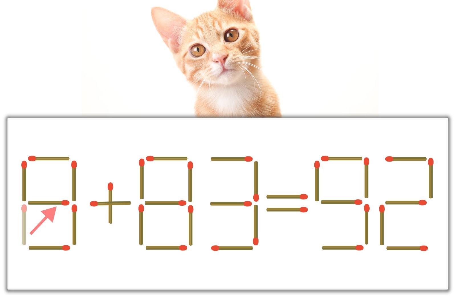 問題の「0」を別の数字に変化させると答えが導き出せます。0のマッチ棒を1本移動させて、「9」にしてみましょう。すると、「9+83=92」が成立します。