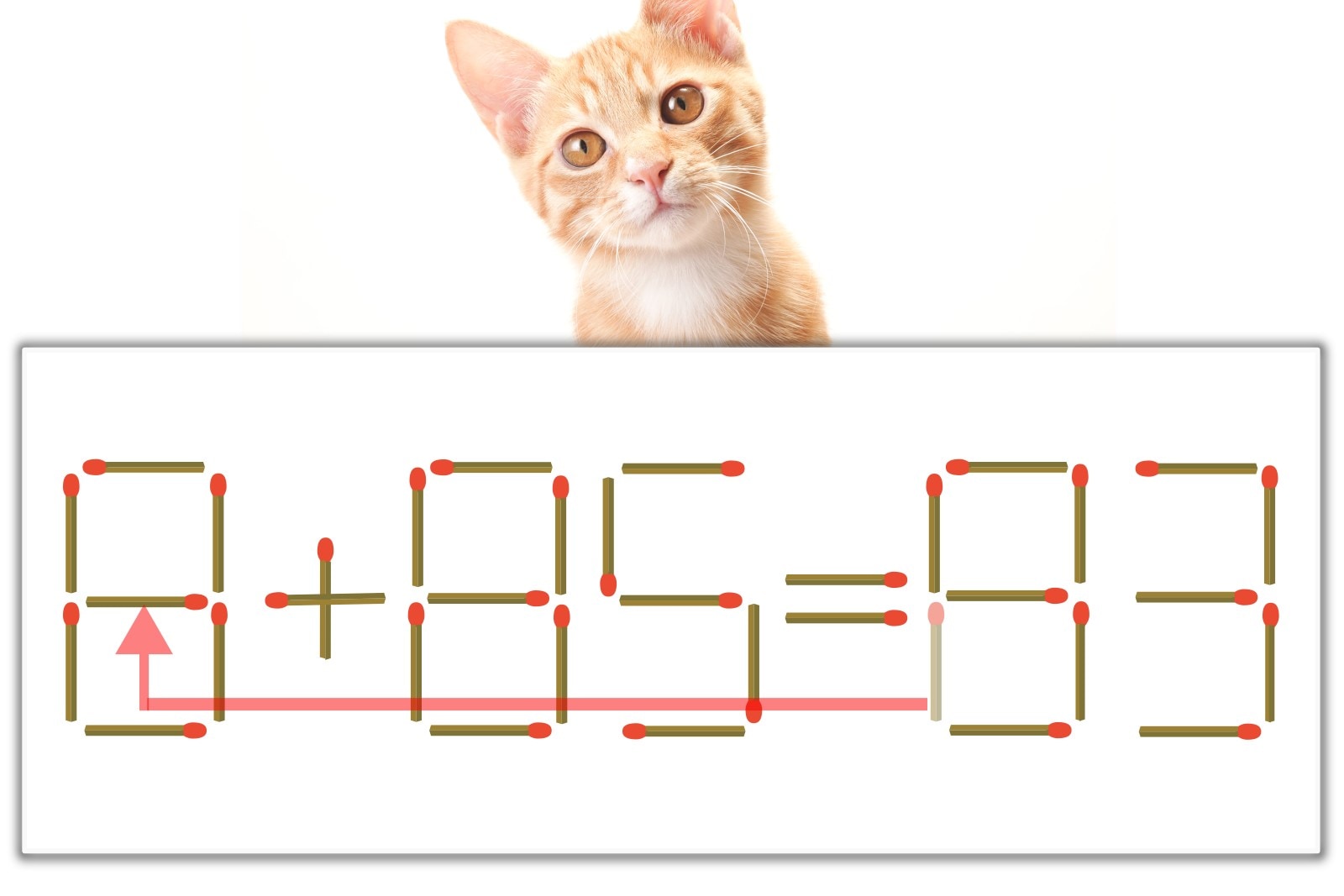 解答の「8」を別の数字に変化させると答えが導き出せます。8のマッチ棒問題の「0」へ1本移動させて、「8」にしてみましょう。すると、「8+85=93」が成立します。