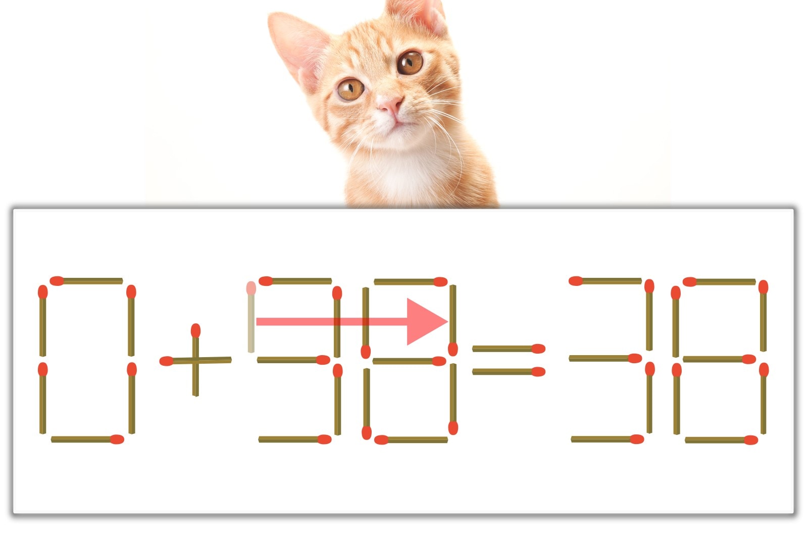 「9」を別の数字に変化させると答えが導き出せます。9のマッチ棒を1本移動させて、「6」を「8」にしてみましょう。すると、「0+38=38」が成立します。