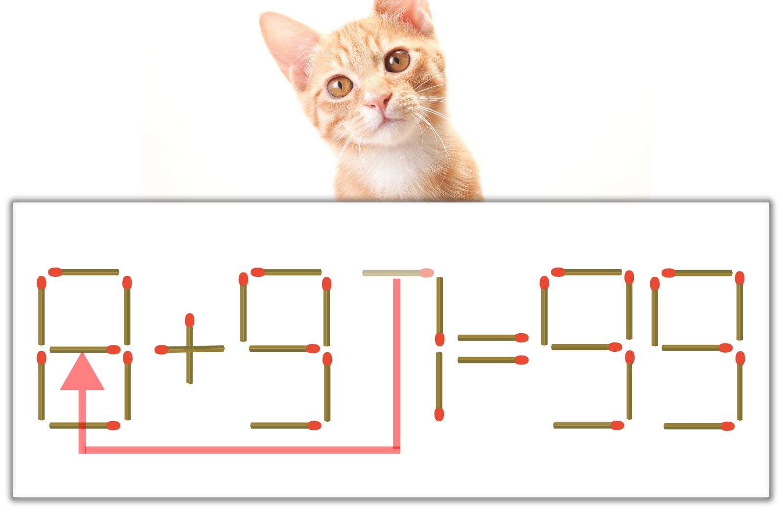 「7」を別の数字に変化させると答えが導き出せます。「7」のマッチ棒を1本左に移動して、「0」を「8」にしてみましょう。すると、「8+91=99」が成立します。