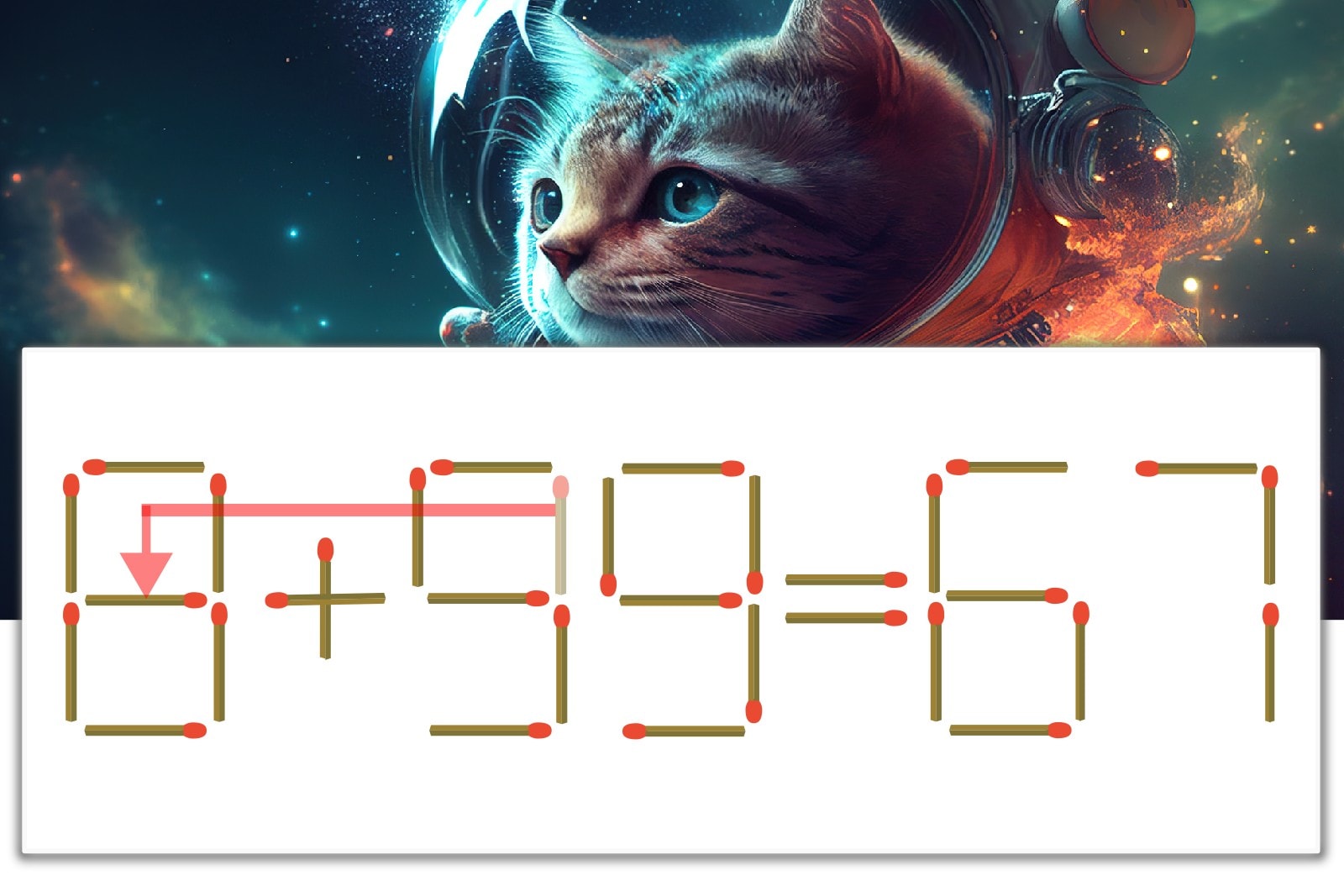 「9」を別の数字に変化させると答えが導き出せます。十の位の「9」のマッチ棒を1本移動して、「0」を「8」にしてみましょう。すると、「8+59=67」が成立します。