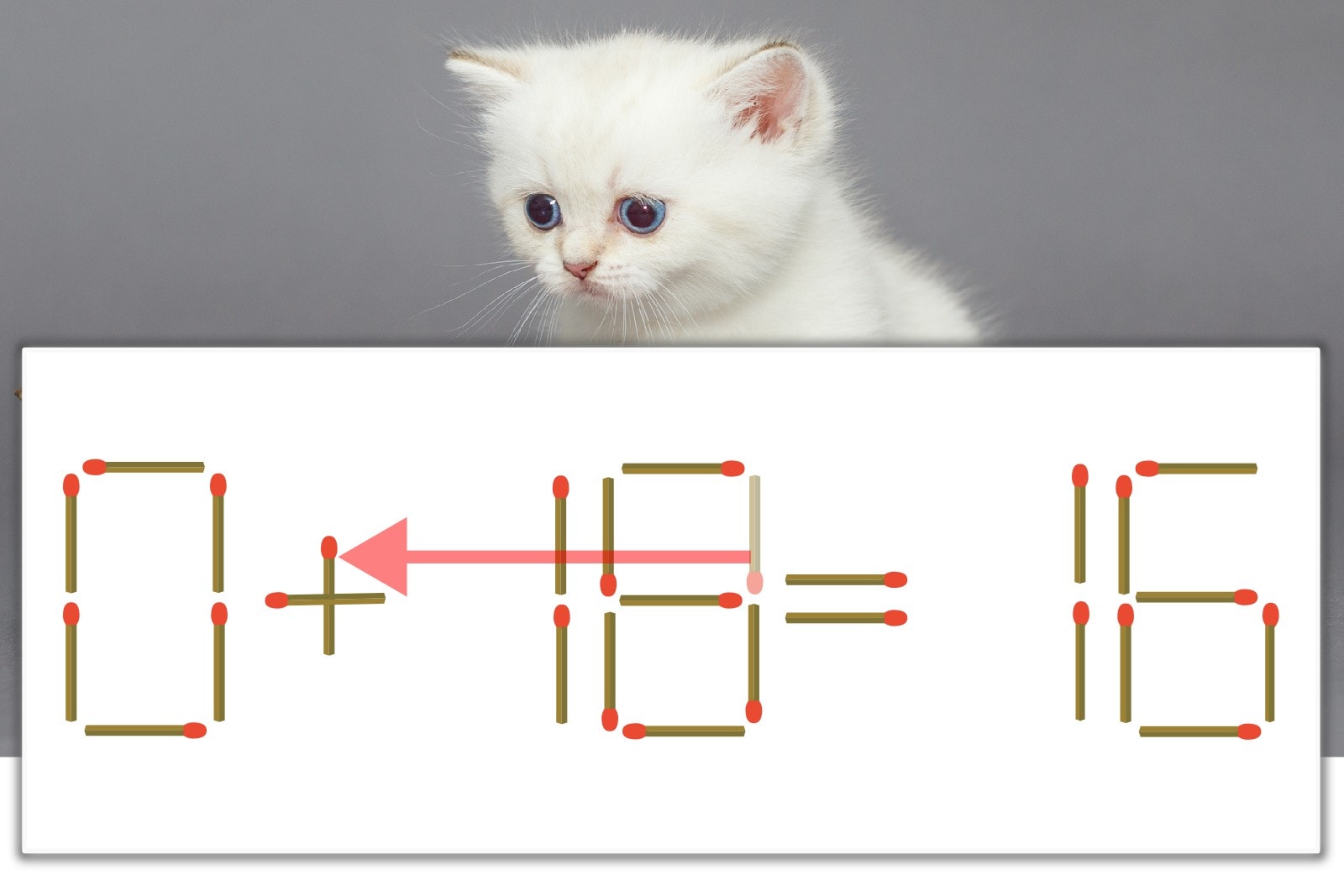 「8」を別の数字に変化させると答えが導き出せます。「8」のマッチ棒を1本移動して、「-」を「+」にしてみましょう。すると、「0+16=16」が成立します。