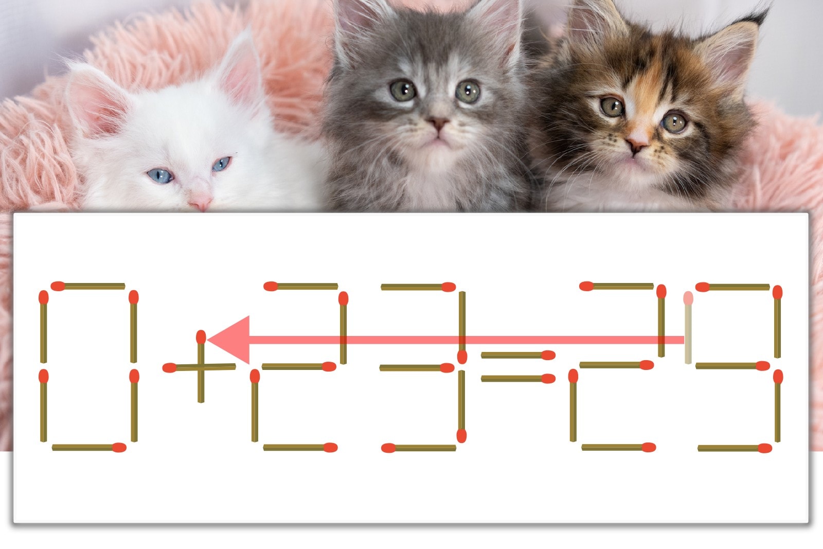 「9」を別の数字に変化させると答えが導き出せます。「9」のマッチ棒を1本移動して、「-」を「+」にしてみましょう。すると、「0+23=23」が成立します。