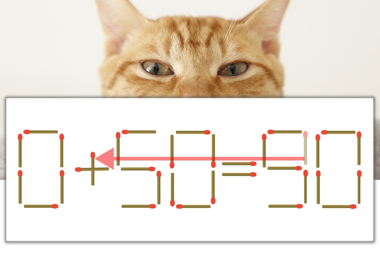 「9」を別の数字に変化させると答えが導き出せます。「9」のマッチ棒を1本移動して、「-」を「+」にしてみましょう。すると、「0+50=50」が成立します。