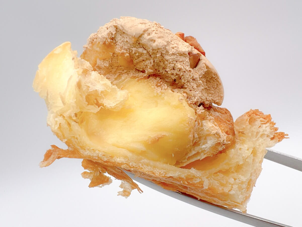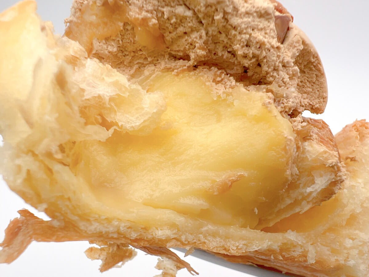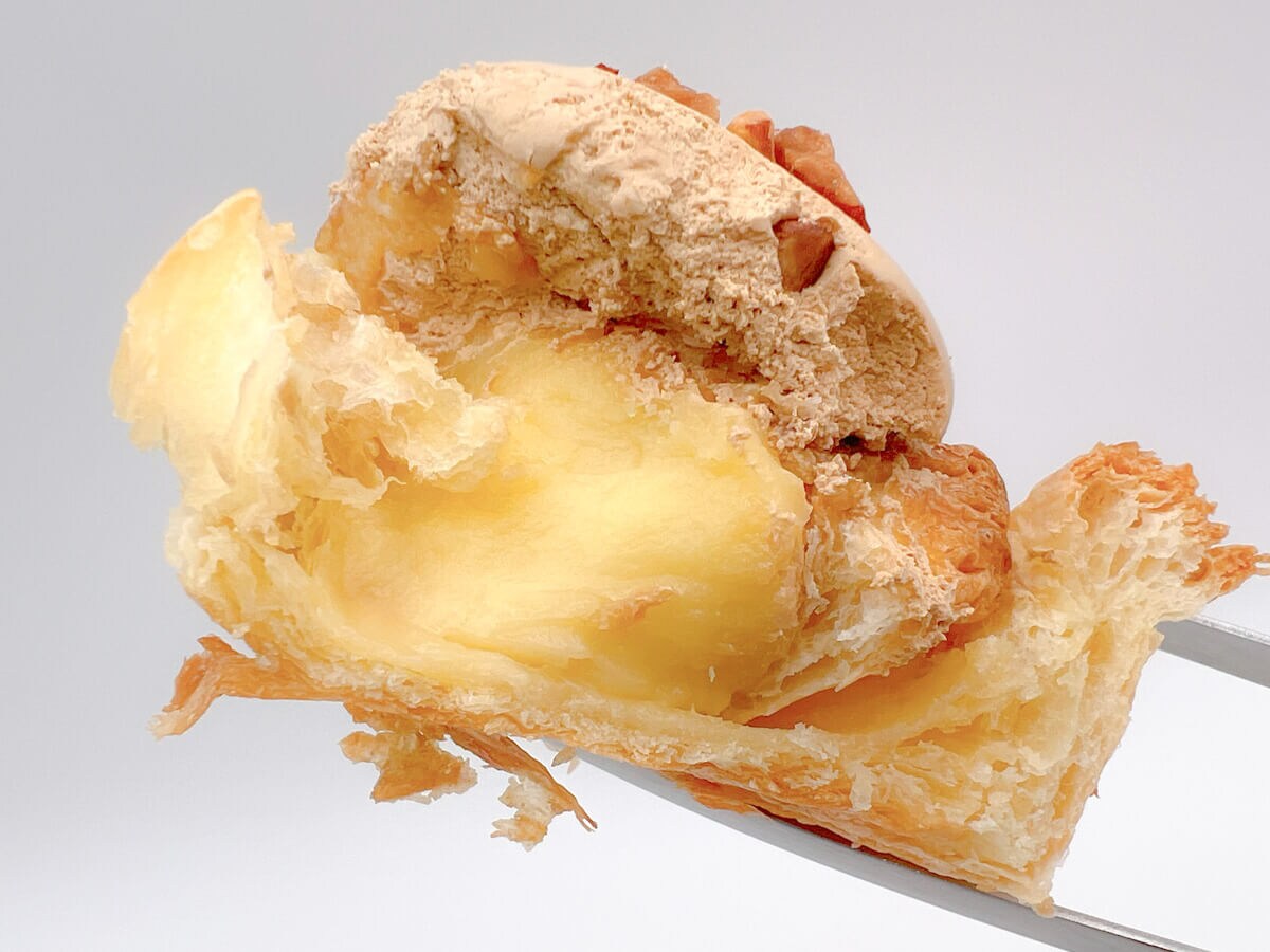 デニッシュ生地の中に、キャラメルホイップとカスタードクリームがたっぷり入っていて、値段以上の満足感があります。キャラメルホイップは口溶けの良く、キャラメルの甘香ばしさが口の中で広がります。一方で、カスタードクリームはとろりとした食感と、卵の風味が効いた濃厚な甘さが楽しめます。
