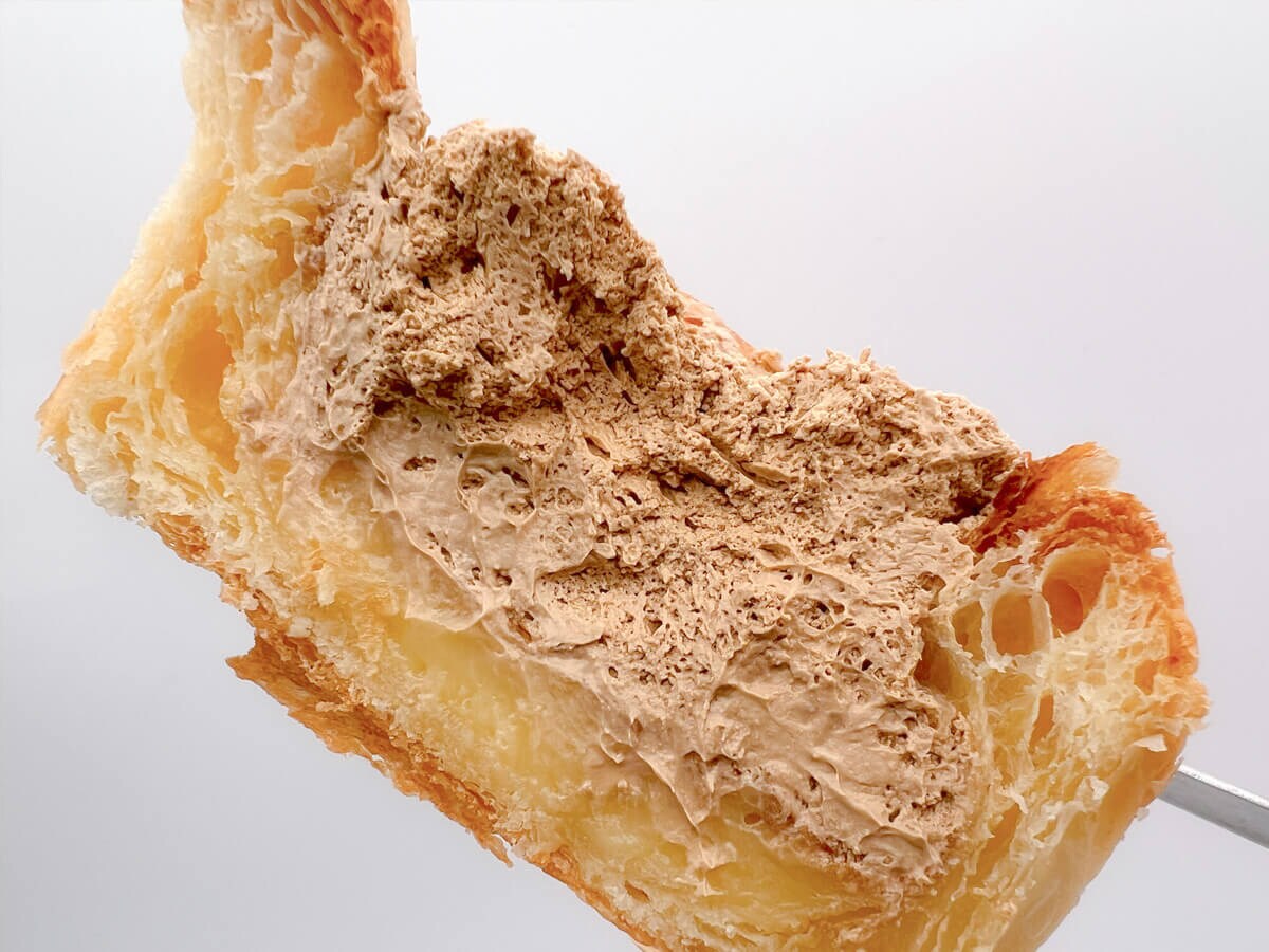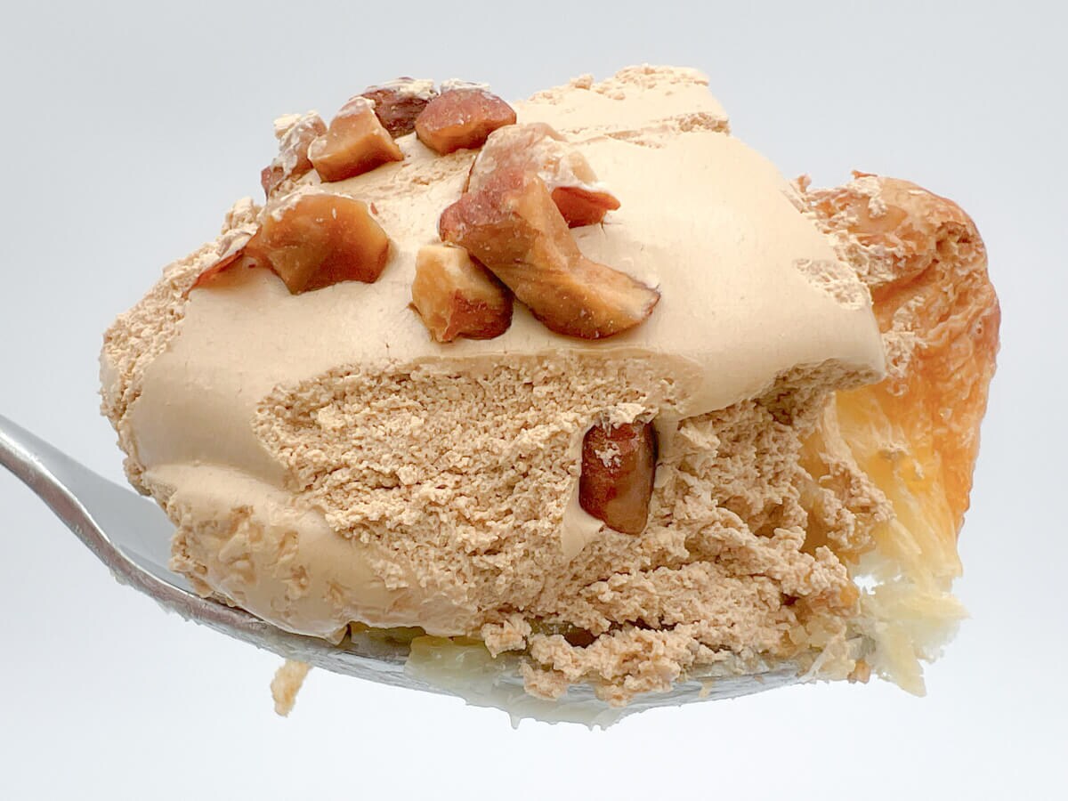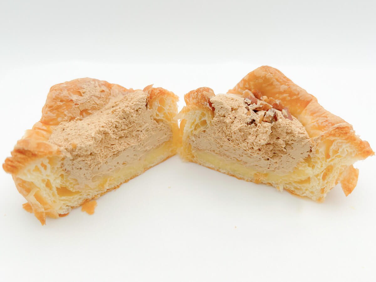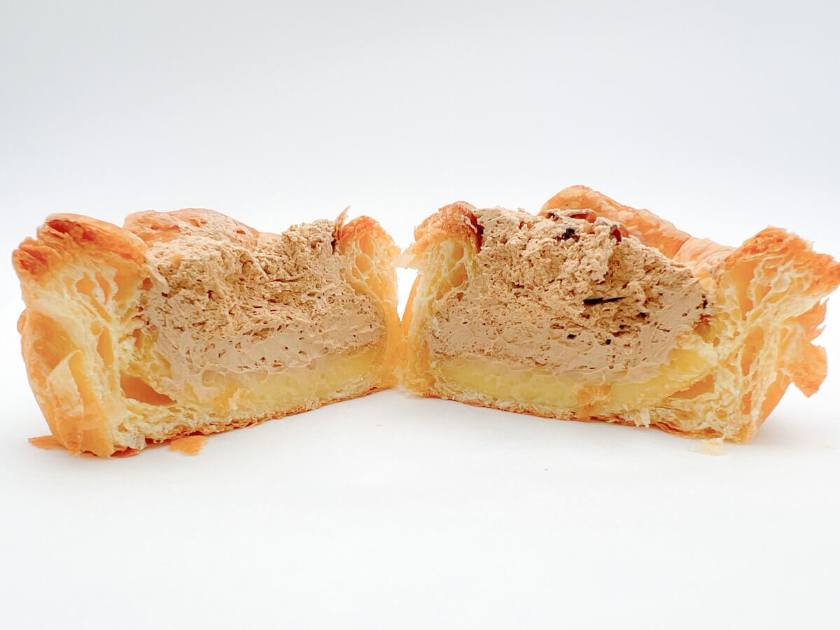 デニッシュ生地の中に、キャラメルホイップとカスタードクリームがたっぷり入っていて、値段以上の満足感があります。キャラメルホイップは口溶けの良く、キャラメルの甘香ばしさが口の中で広がります。一方で、カスタードクリームはとろりとした食感と、卵の風味が効いた濃厚な甘さが楽しめます。
