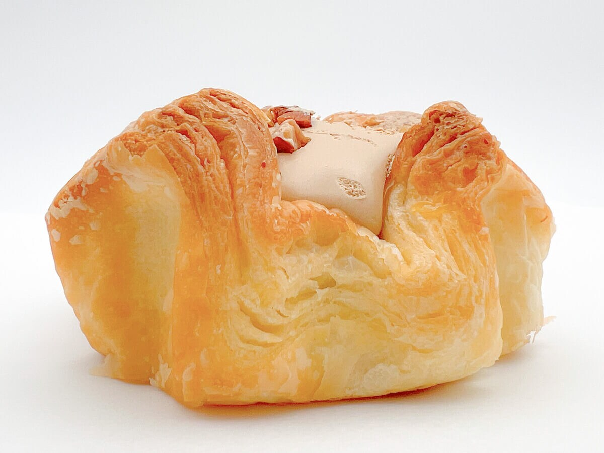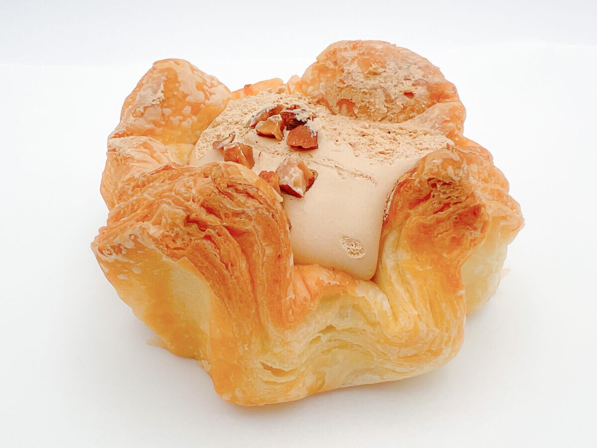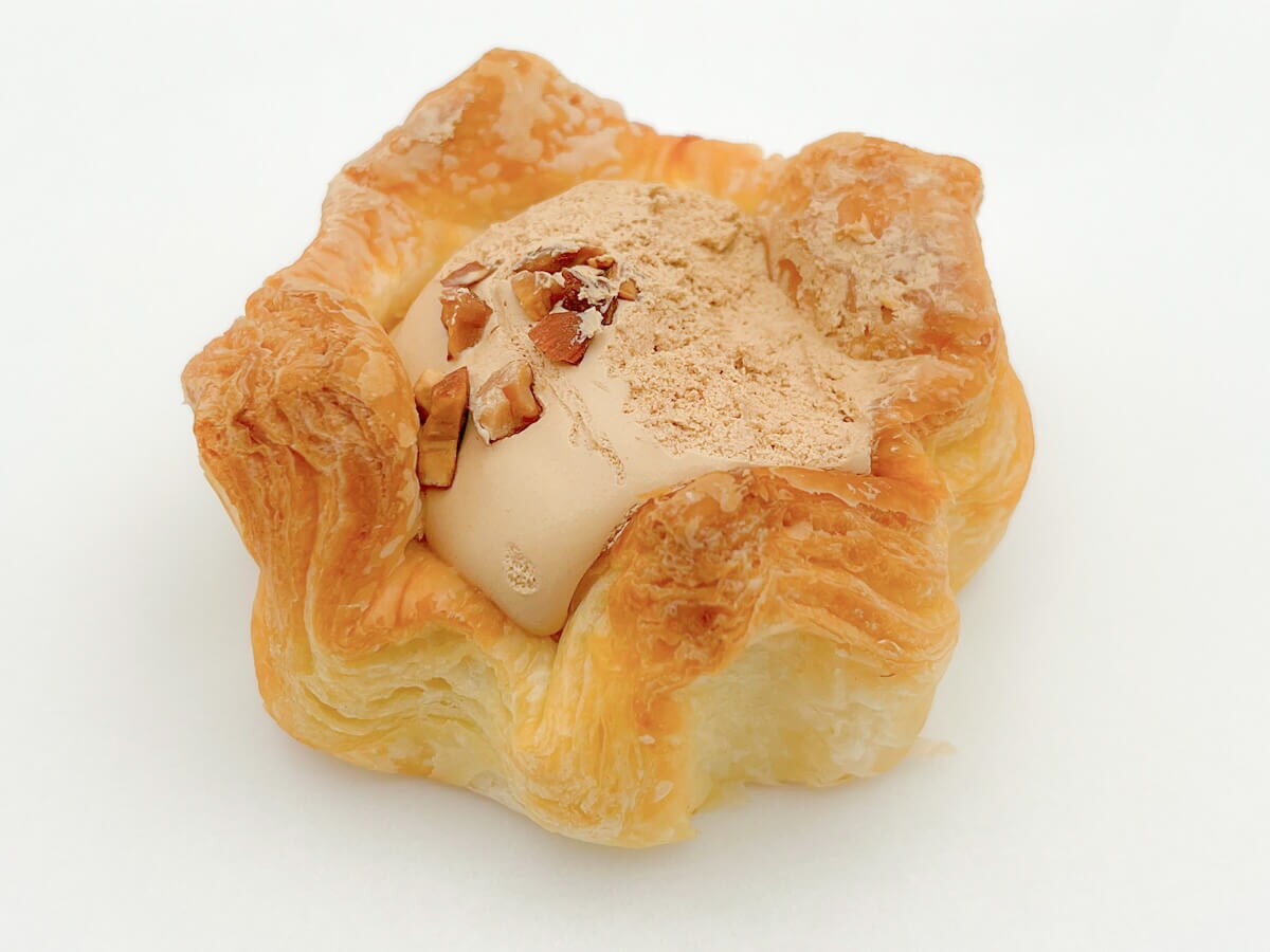 デニッシュ生地に、キャラメルホイップとカスタードクリームを絞り、天面にはナッツをトッピングしています。