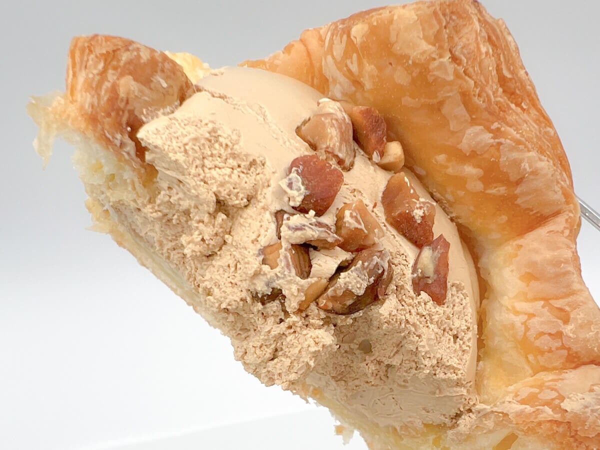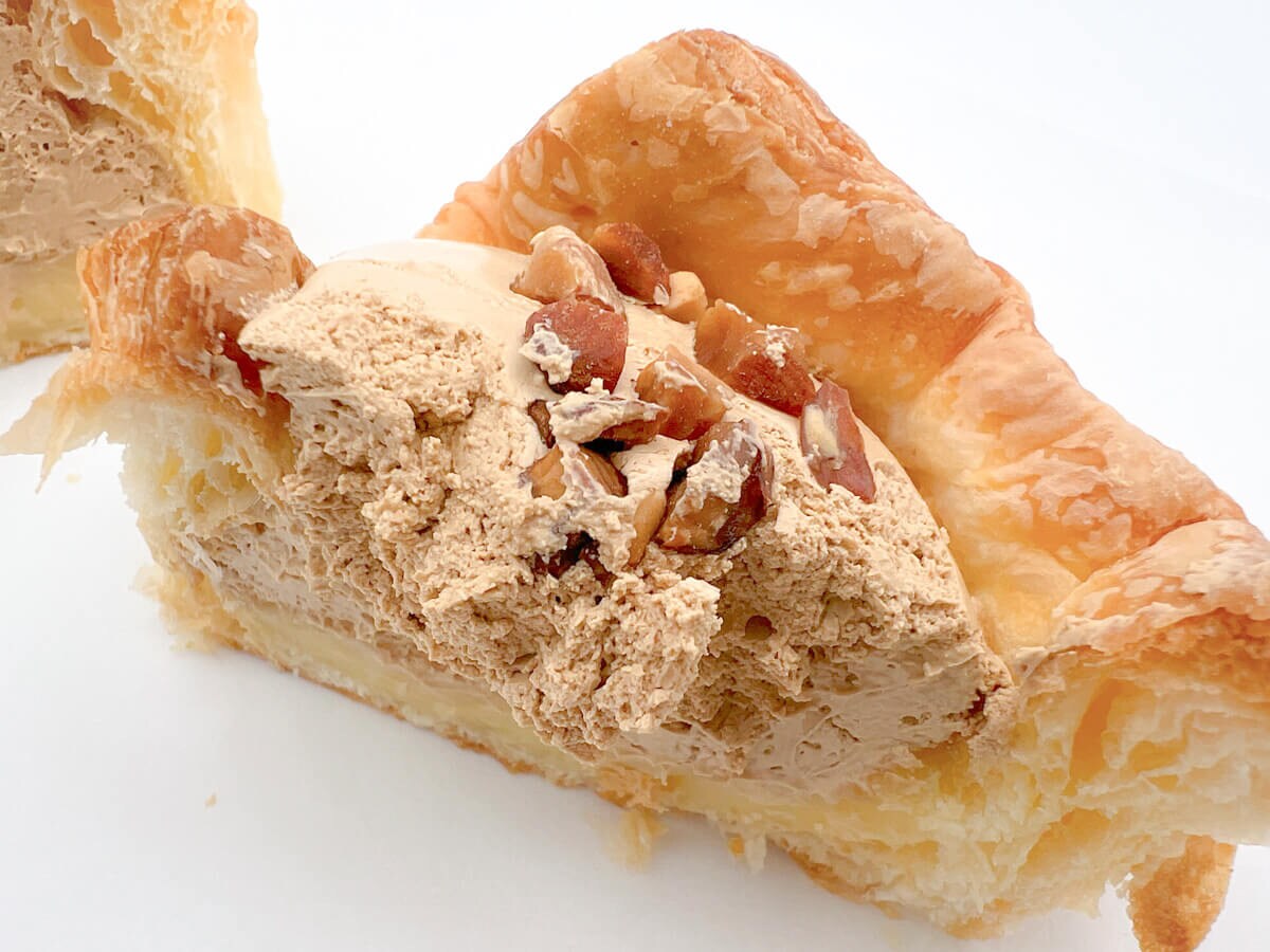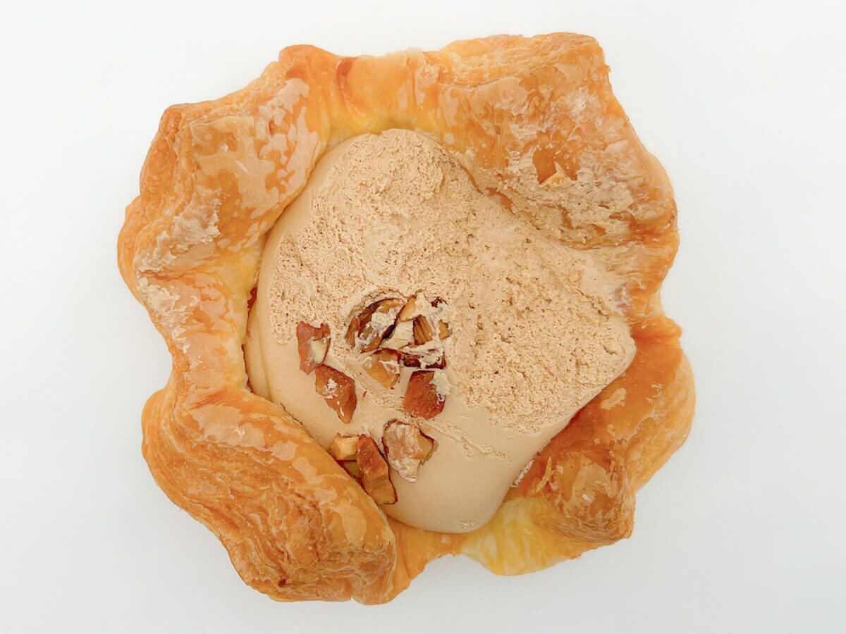 デニッシュ生地に、キャラメルホイップとカスタードクリームを絞り、天面にはナッツをトッピングしています。
