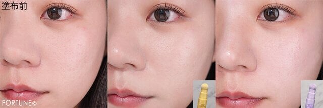 塗布前と塗布後を見比べると、くすみや色ムラを自然にカバーしつつ、明るさと透明感がプラスされています。