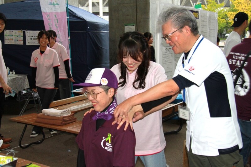 学生と教員が「がんカフェ」ブースの一角で東洋医学をテーマにした体験コーナーを設け、来場者に向けて健康維持のための“セルフケア”を紹介しました。