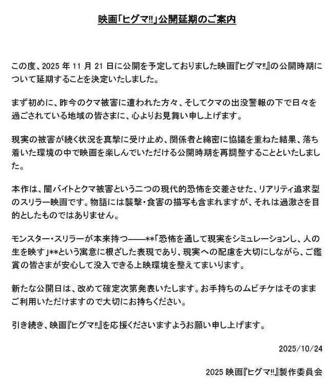 この度、2025年11月21日に公開を予定しておりました映画『ヒグマ‼』の公開時期について延期することを決定いたしました。