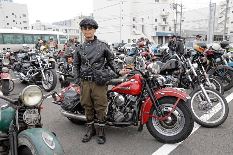 ストックスタイルの貴重な「ヨンパチ」乗りの鳴瀧さんは、アビエイタースタイルのカムストックを愛用。レザーもバイクも、ヘルメットなどのギアも含めて、ヴィンテージ愛が香り立つ玄人好みなセンスが光る。
