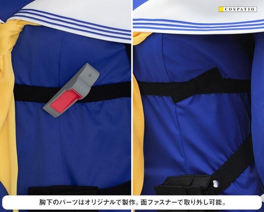 素材:ブラウス表地(ポリエステル100%)、ゴム(ナイロン、ポリエステル、ラバー)、勲章(亜鉛合金・真鍮)、スカーフ表地(ポリエステル100%)、ポーチ表地(ポリエステル65%、綿35%)、グローブ表地(ポリエステル84%、ポリウレタン16%)