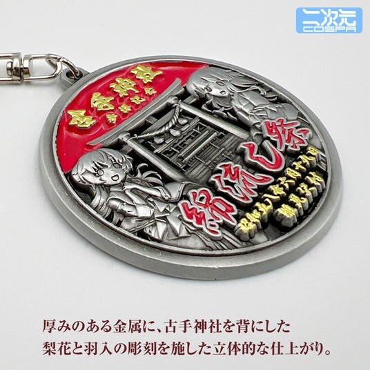 ・古手神社を背にした梨花と羽入を、懐かしい風合いのメタルキーホルダーにしました。